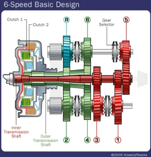 듀얼 클러치 변속기(DCT) 사용법 (출처 나무위키) 듀얼 클러치 변속기(DCT)는 두 개의 클러치를 사용해 변속 속도가 빠르고 스포츠 주행에 적합해요. 자동 변속기처럼 편리하지만 기계적인 변속감이 있어요.