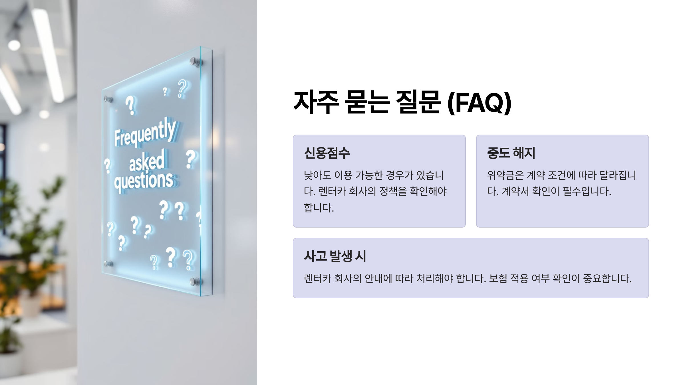 A7. 네, 대부분의 장기렌트는 중간 해지가 가능하지만, 해지비용이 발생할 수 있으므로 확인이 필요해요.