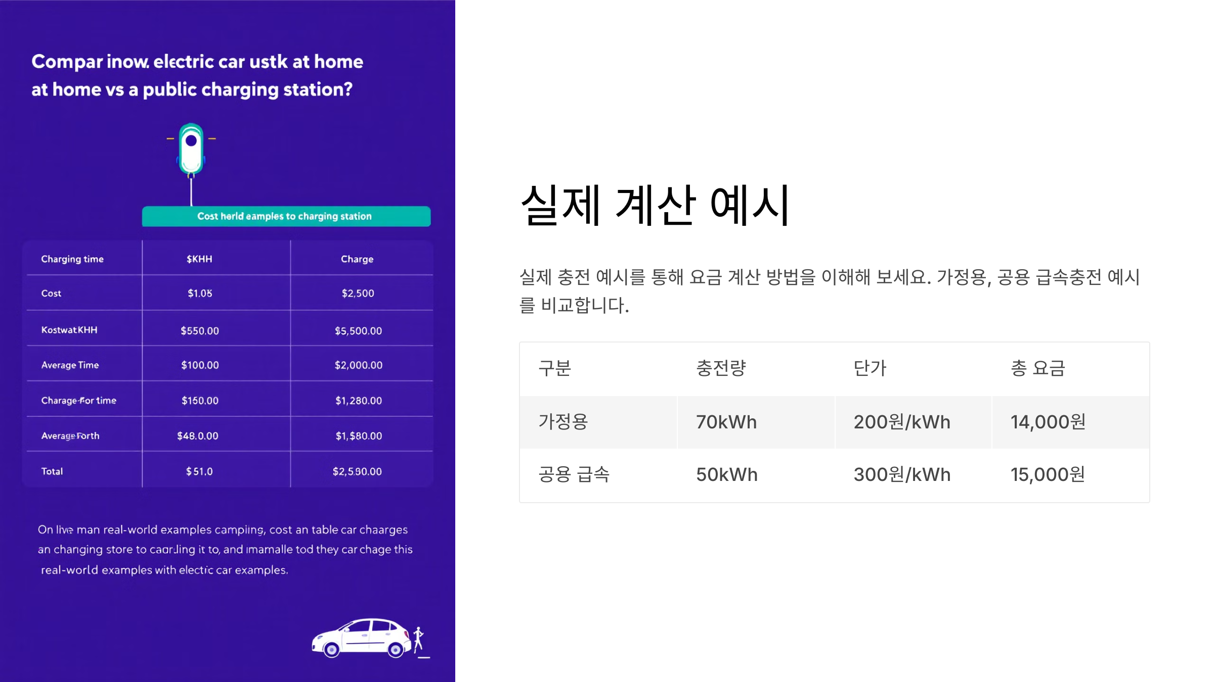 이제 계산이 끝났어요. 충전소의 요금이 300원/kWh일 때, 24kWh를 충전하면 총 24kWh × 300원 = 7,200원이 됩니다.