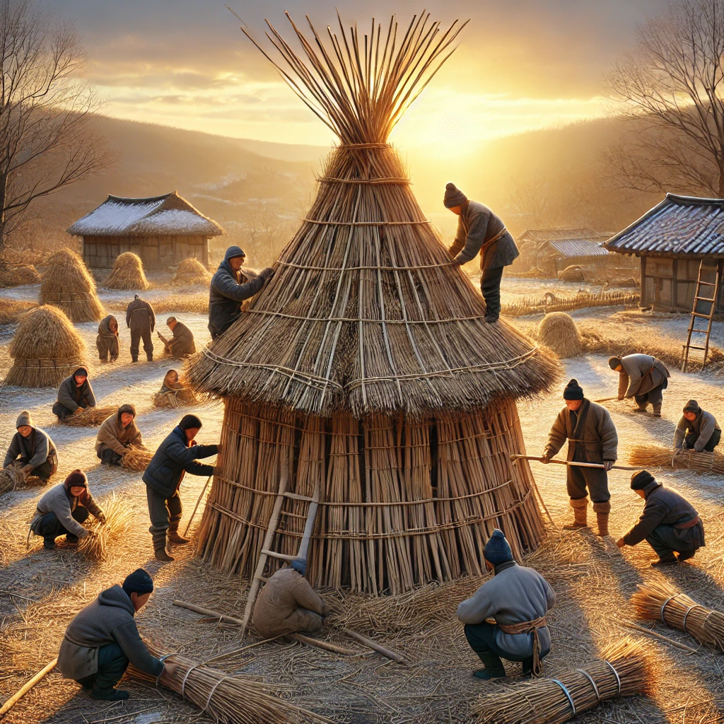 - 🛖 달집 구조 세우기: 나뭇가지를 원뿔형으로 쌓아 올려요. 중심 기둥이 튼튼해야 해요.