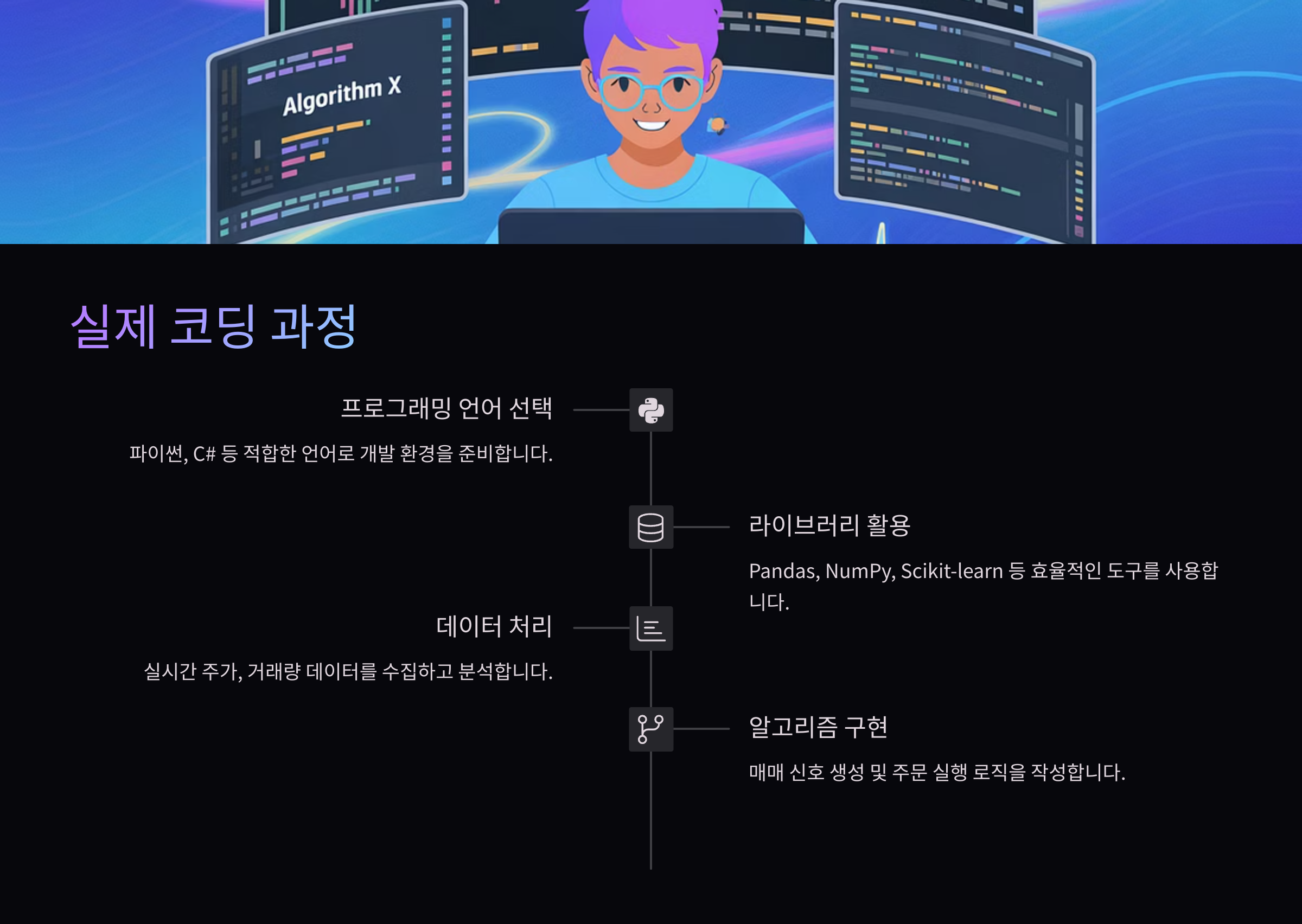 간단한 매매 로직부터 시작하면 어느새 나만의 로봇 트레이더가 완성돼요!