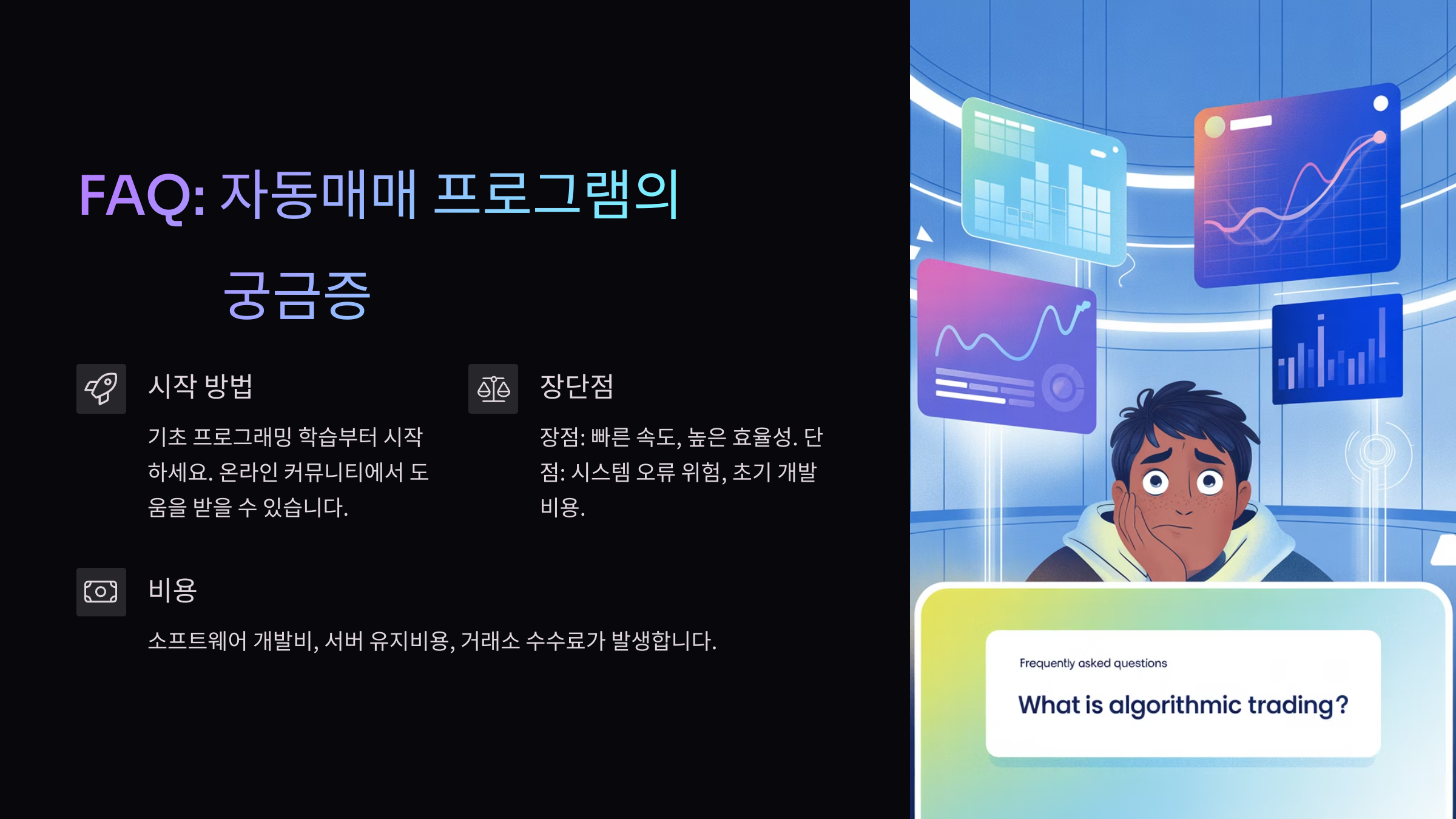 Q1. 주식 자동매매 프로그램은 초보자도 만들 수 있나요?A1. 네! Python과 API 사용법을 조금만 익히면 초보자도 충분히 만들 수 있어요. 시작이 어렵게 느껴질 뿐, 한 단계씩 따라가면 누구나 도전할 수 있답니다.