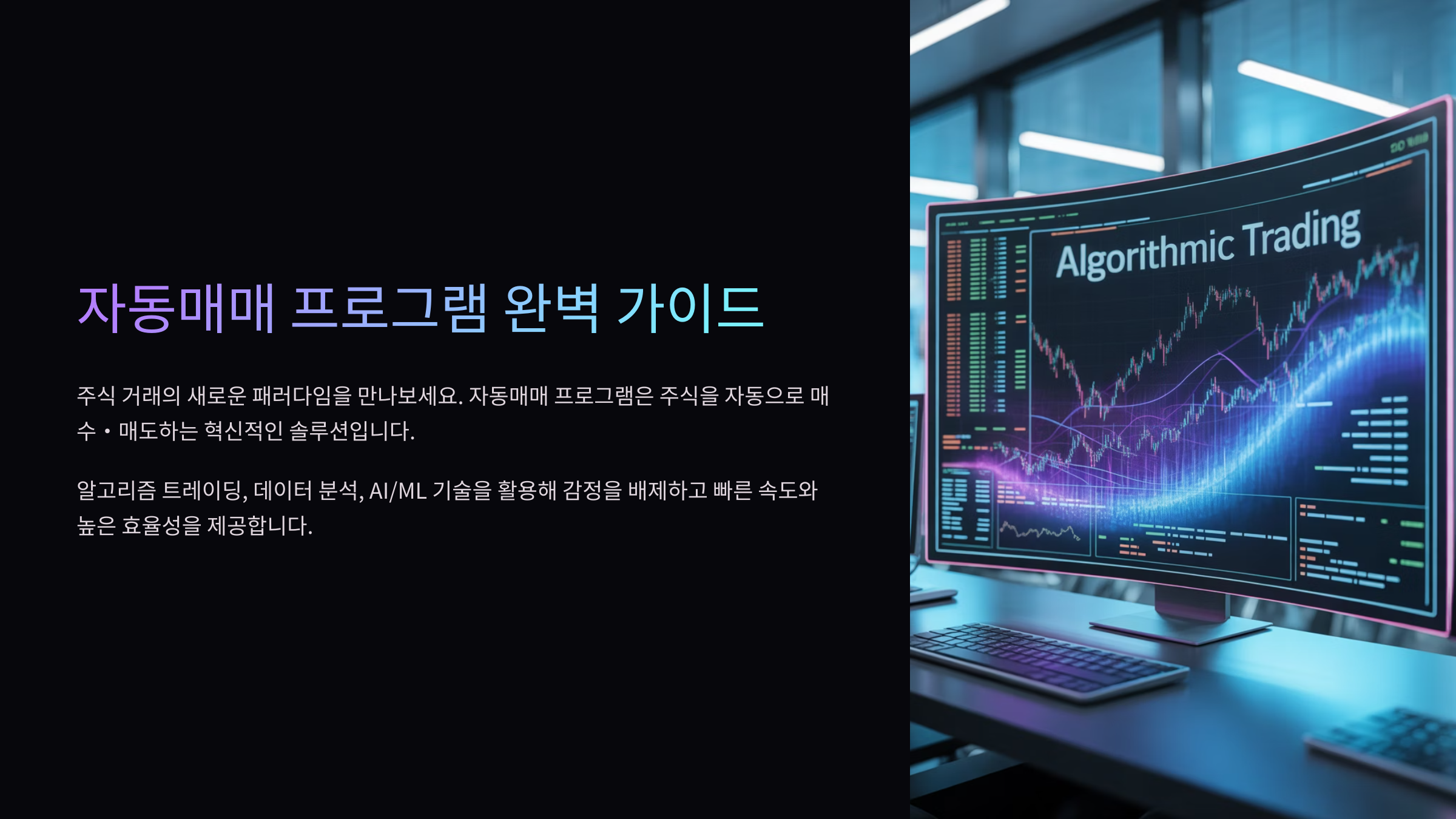 자동매매 프로그램은 투자자의 개입 없이 컴퓨터가 주식 매매를 수행하는 시스템을 말해요. 미리 정해진 조건이나 알고리즘에 따라 주식을 사고파는 거예요.예를 들어, "A 종목이 5% 이상 떨어지면 매수"라는 조건을 걸어놓으면, 프로그램은 사람이 따로 명령하지 않아도 이 조건이 충족되면 자동으로 매수 주문을 넣어요.
