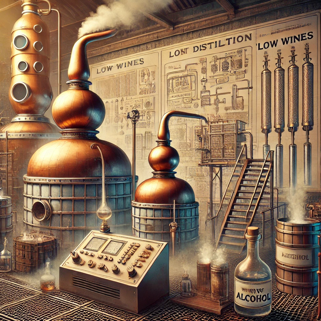 발효된 액체는 증류기로 옮겨져 첫 번째 증류를 시작합니다. 이 과정에서 생성된 알코올은 '로우 와인'이라고 불리며, 알코올 농도가 비교적 낮습니다.