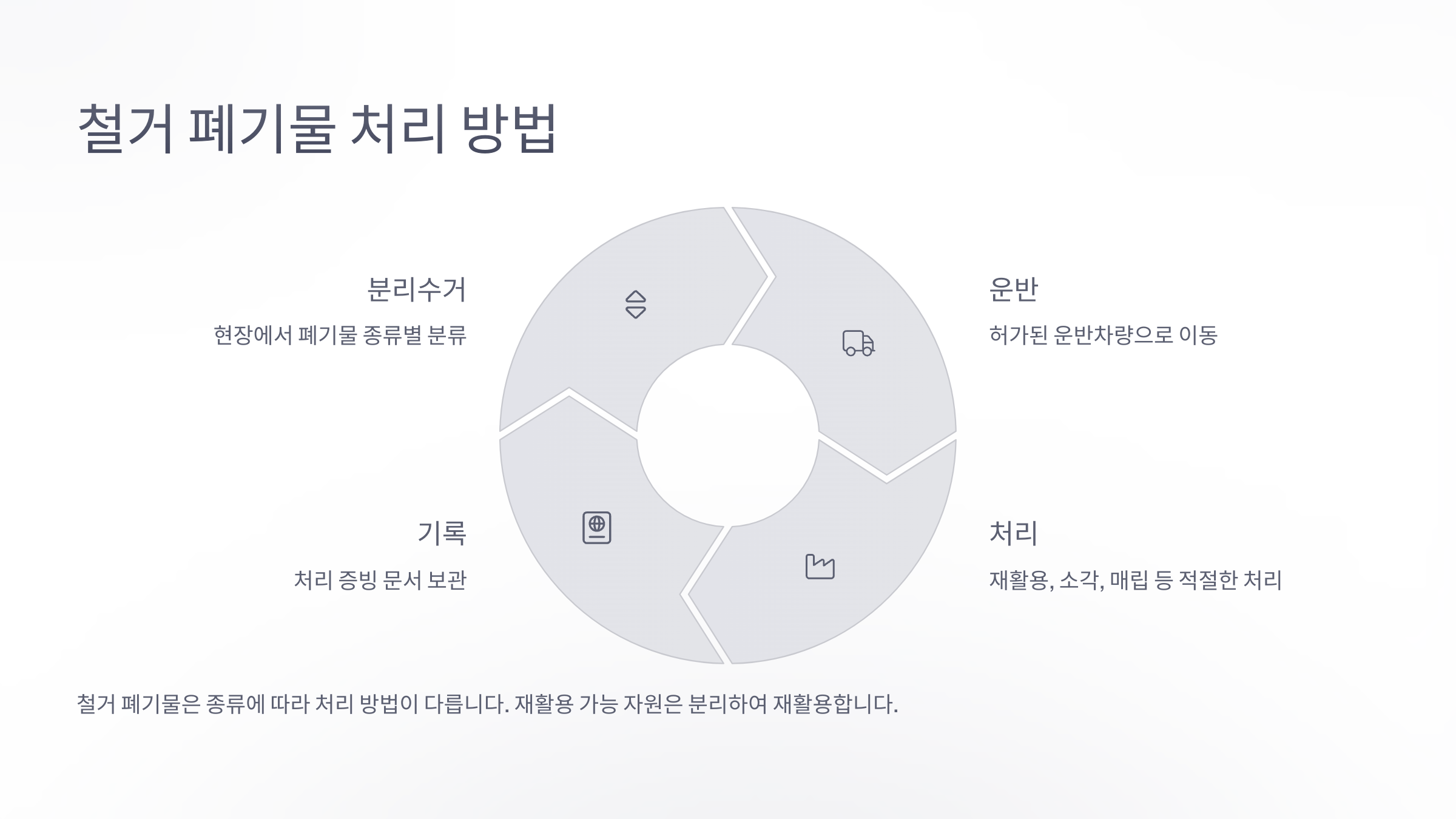 '처리' 단계는 재활용 가능한 자재는 선별해서 재활용하고, 불가한 폐기물은 전문 처리장에서 소각하거나 매립해요. 이때 처리 확인서 발급까지 꼭 받아야 해요!