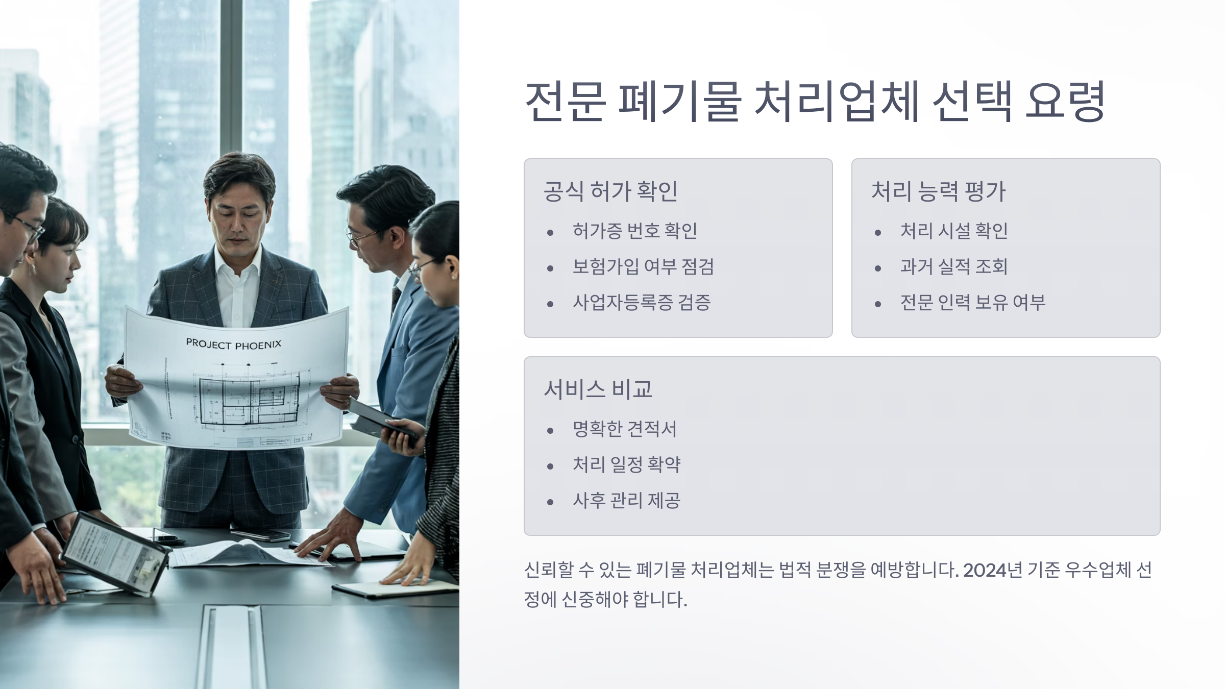 첫 번째로, '허가증'을 꼭 확인하세요. 폐기물 수집·운반업, 중간처리업, 최종처리업 각각 별도의 허가가 필요해요. 이게 없으면 아무리 유명한 업체라도 맡기면 큰일 나요.