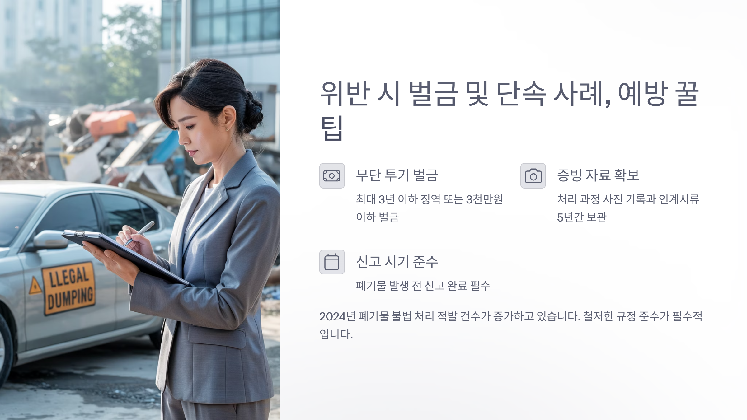 폐기물을 처리할 때 무단 투기하거나 허가받지 않은 업체에 맡기면, 1천만 원 이상의 과태료는 물론 형사처벌까지 받을 수 있어요. 심하면 영업 정지나 면허 취소까지 이어질 수 있답니다.