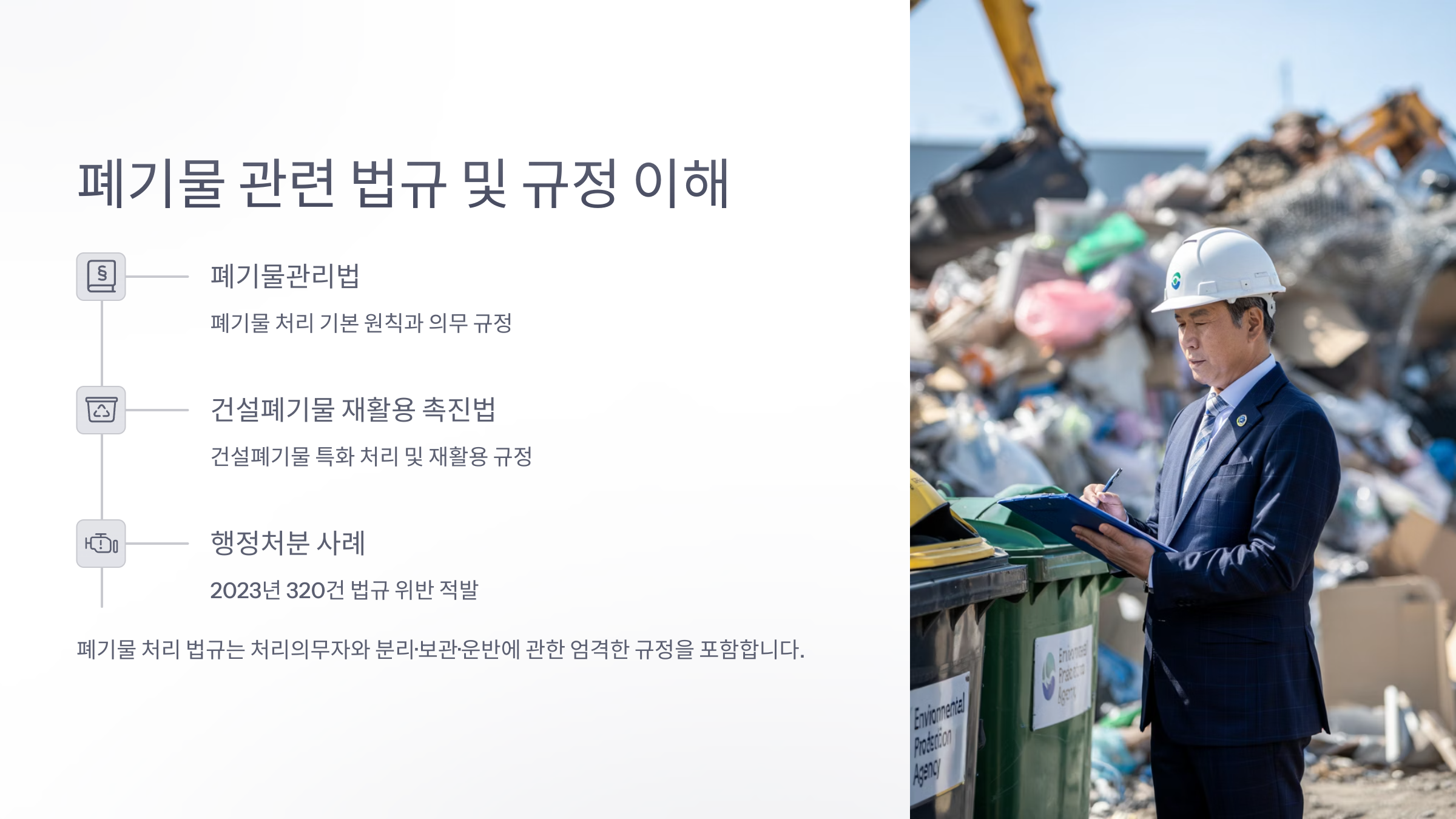 건물을 철거하면 어마어마한 양의 폐기물이 쏟아져 나오는데요. 이걸 제대로 처리하지 않으면 꽤 무거운 벌금을 물게 될 수 있어요. 2025년 현재, 폐기물 관리 규정이 더욱 강화되어 있기 때문에 특히 조심해야 해요.