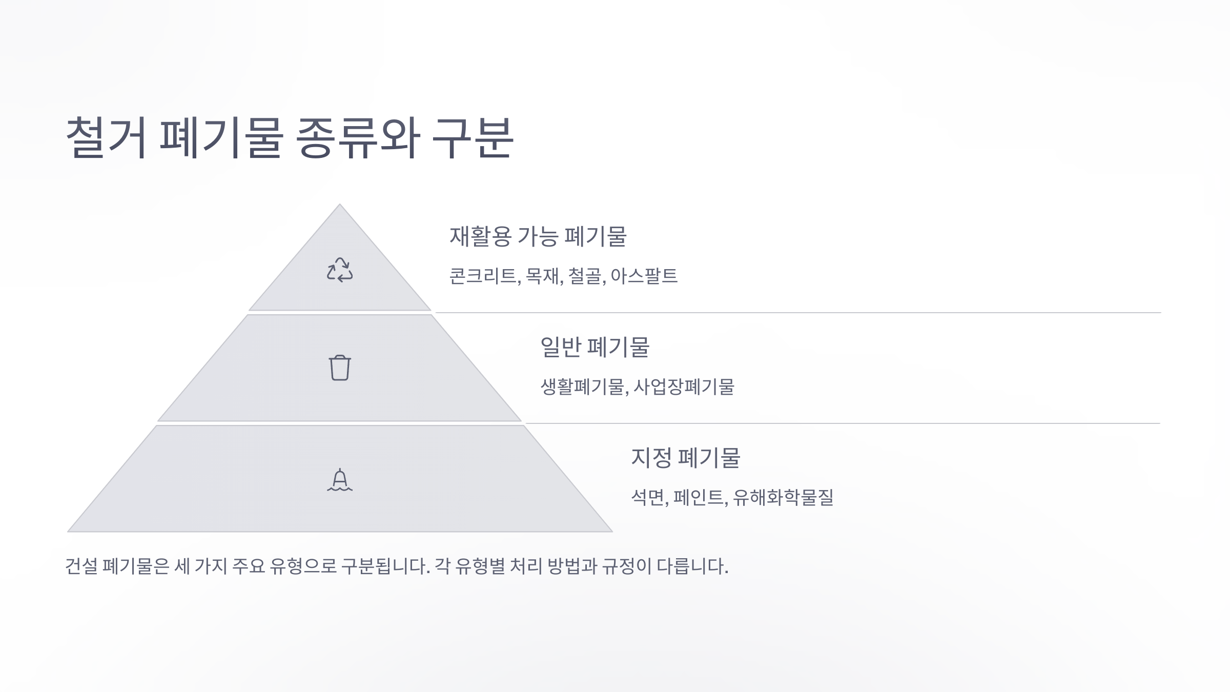 철거 작업을 시작하면 다양한 종류의 폐기물이 발생해요. 이걸 정확히 구분하는 게 첫 번째 단계랍니다. 주로 나오는 폐기물은 건축 폐기물, 혼합 폐기물, 지정 폐기물로 나눌 수 있어요.건축 폐기물은 콘크리트, 벽돌, 블록, 목재처럼 건물 구조를 이루는 재료들이에요. 주로 무겁고 부피가 커서 별도로 분류해 운반해야 하죠.