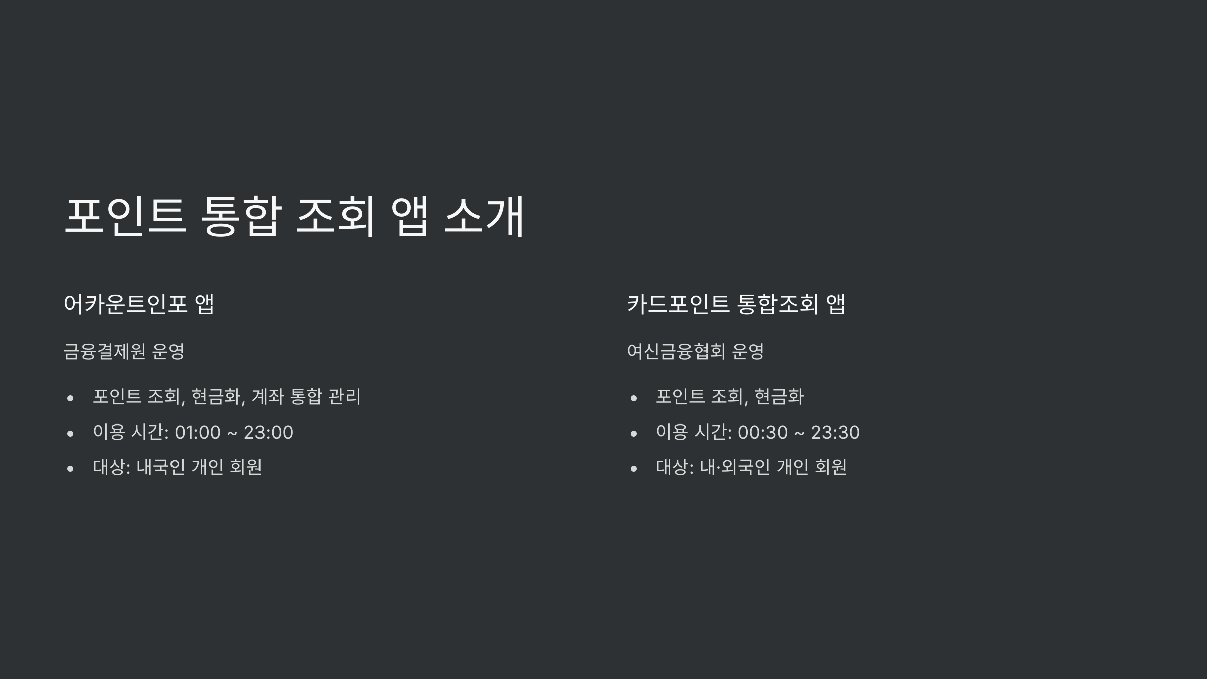 이 문제를 해결하기 위해 금융위원회와 여신금융협회가 나서서 모든 카드사 포인트를 '한눈에 확인하고, 한 번에 현금화할 수 있는 시스템'을 구축한 거예요. 그게 바로 '카드 포인트 통합조회·현금화 서비스'랍니다.