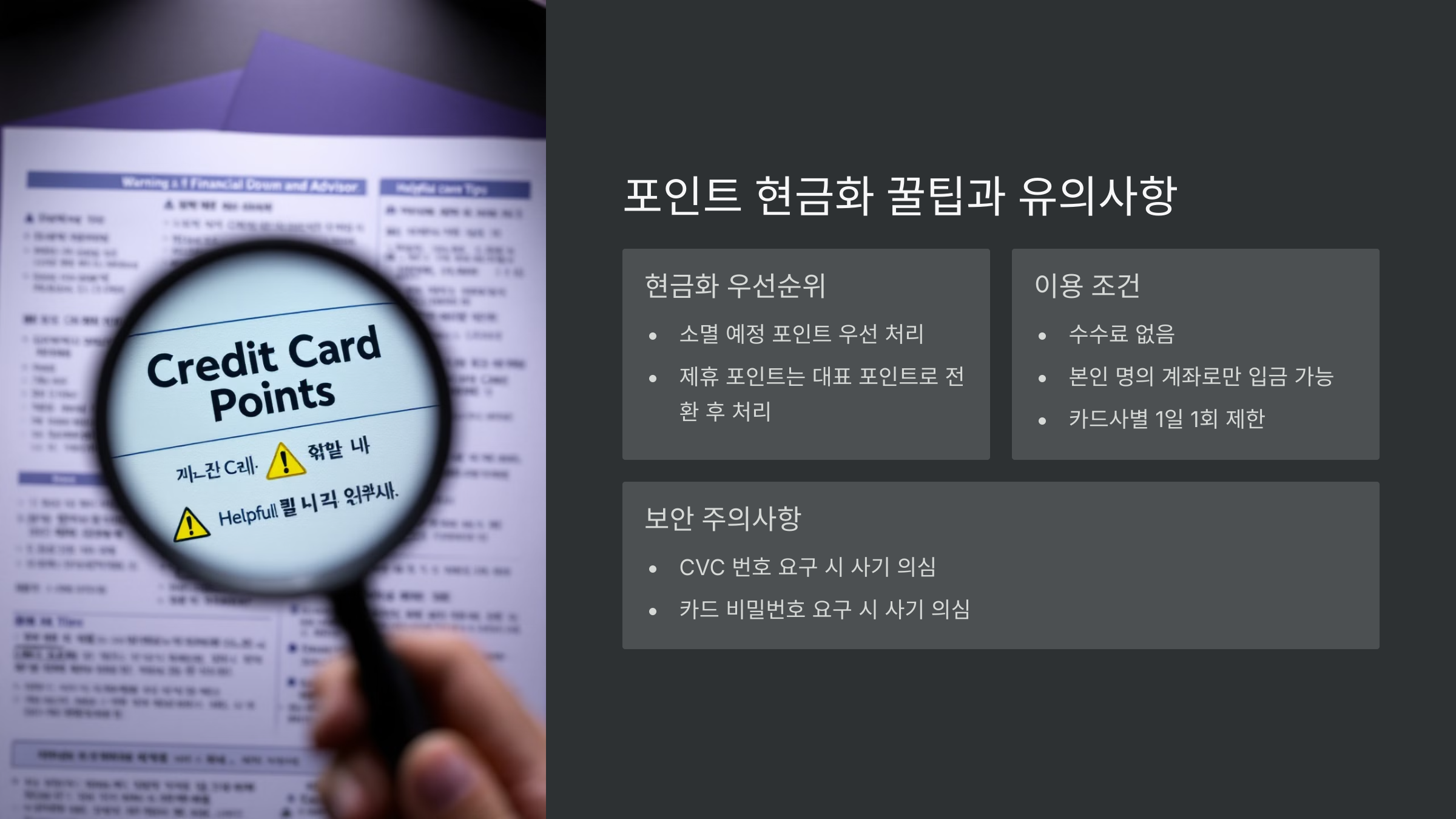 카드 포인트를 잘만 활용하면 생각보다 꽤 쏠쏠한 '숨은 돈'을 찾을 수 있어요. 하지만 무턱대고 현금화하려다 놓치기 쉬운 포인트들도 있어서 주의할 점도 함께 알아두는 게 좋아요!