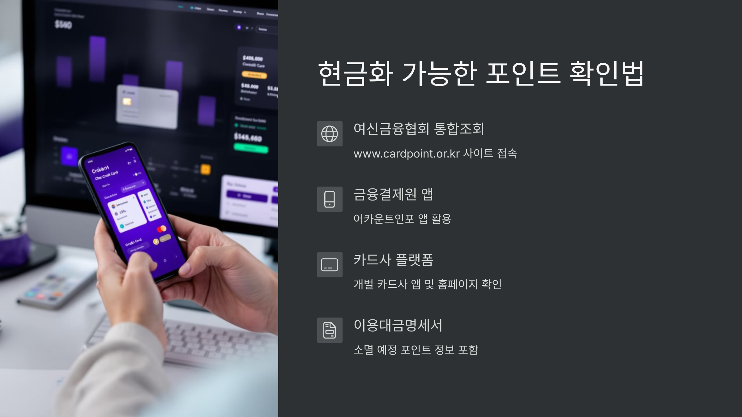 모든 포인트가 바로 현금화되는 건 아니라서, '가능한 포인트'인지 먼저 확인하는 게 핵심이에요. 가장 쉬운 방법은 '카드포인트 통합조회' 사이트나 앱에서 조회하는 거예요.