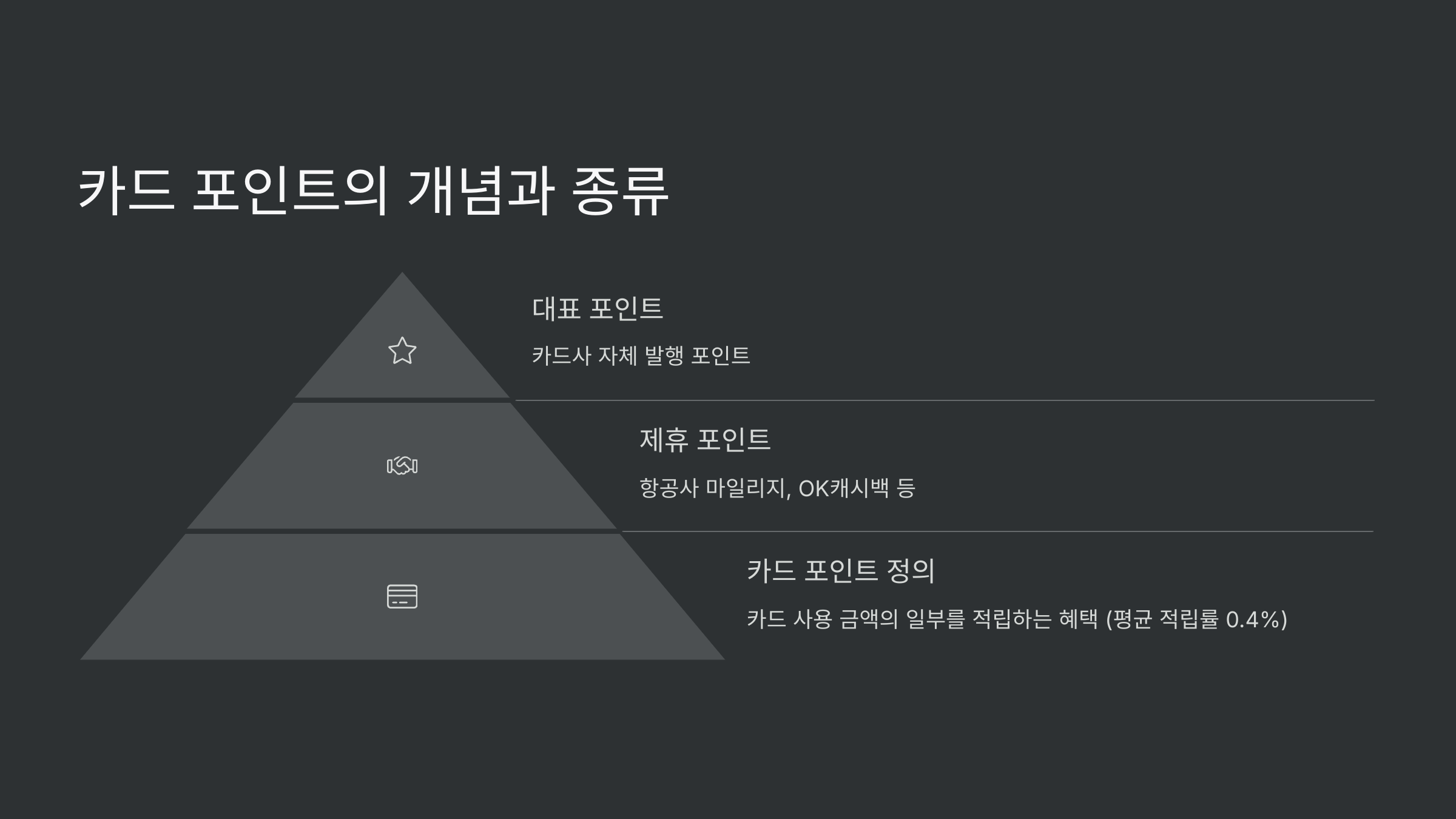 예를 들어 삼성카드는 '삼성카드 포인트', KB국민카드는 '포인트리', 신한카드는 '마이신한포인트', 현대카드는 'M포인트'라는 이름으로 포인트가 쌓여요. 이렇게 이름은 달라도 결국 고객에게 제공하는 일종의 적립 보너스랍니다.