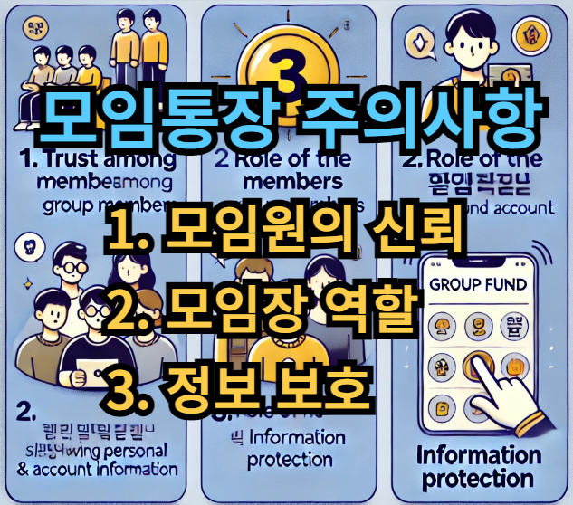 - 정보 보호: 모임통장과 관련된 개인정보 및 계좌 정보는 철저히 보호해야 합니다. 특히 외부로 정보가 유출되지 않도록 주의가 필요합니다. 모임통장 관련 정보는 모임원 외부로 유출되지 않도록 주의해야 하며, 계좌 정보와 비밀번호는 안전하게 관리해야 합니다.