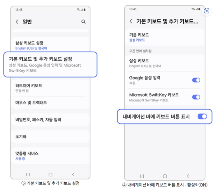 [갤럭시 폰 > 설정 > 일반 > 기본 키보드 및 추가 키보드 설정 > 내비게이션 바에 키보드 버튼 표시 - 활성화(ON)]