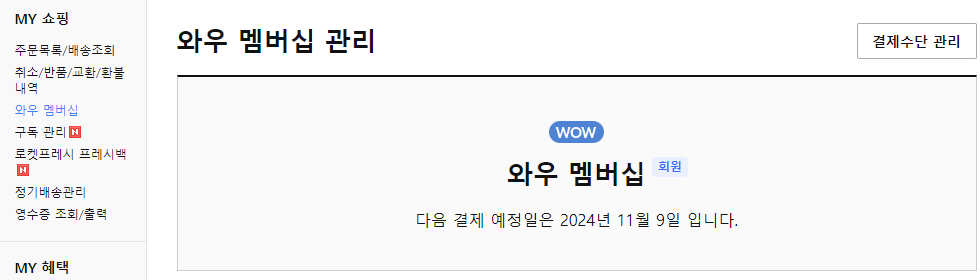 쿠팡 웹사이트에 로그인하여 마이쿠팡으로 들어가서 왼쪽 My 쇼핑 메뉴 세 번째 있는 '와우 멤버십'을 클릭하여 맨 아래에 있는 '해지하기' 버튼을 클릭합니다.