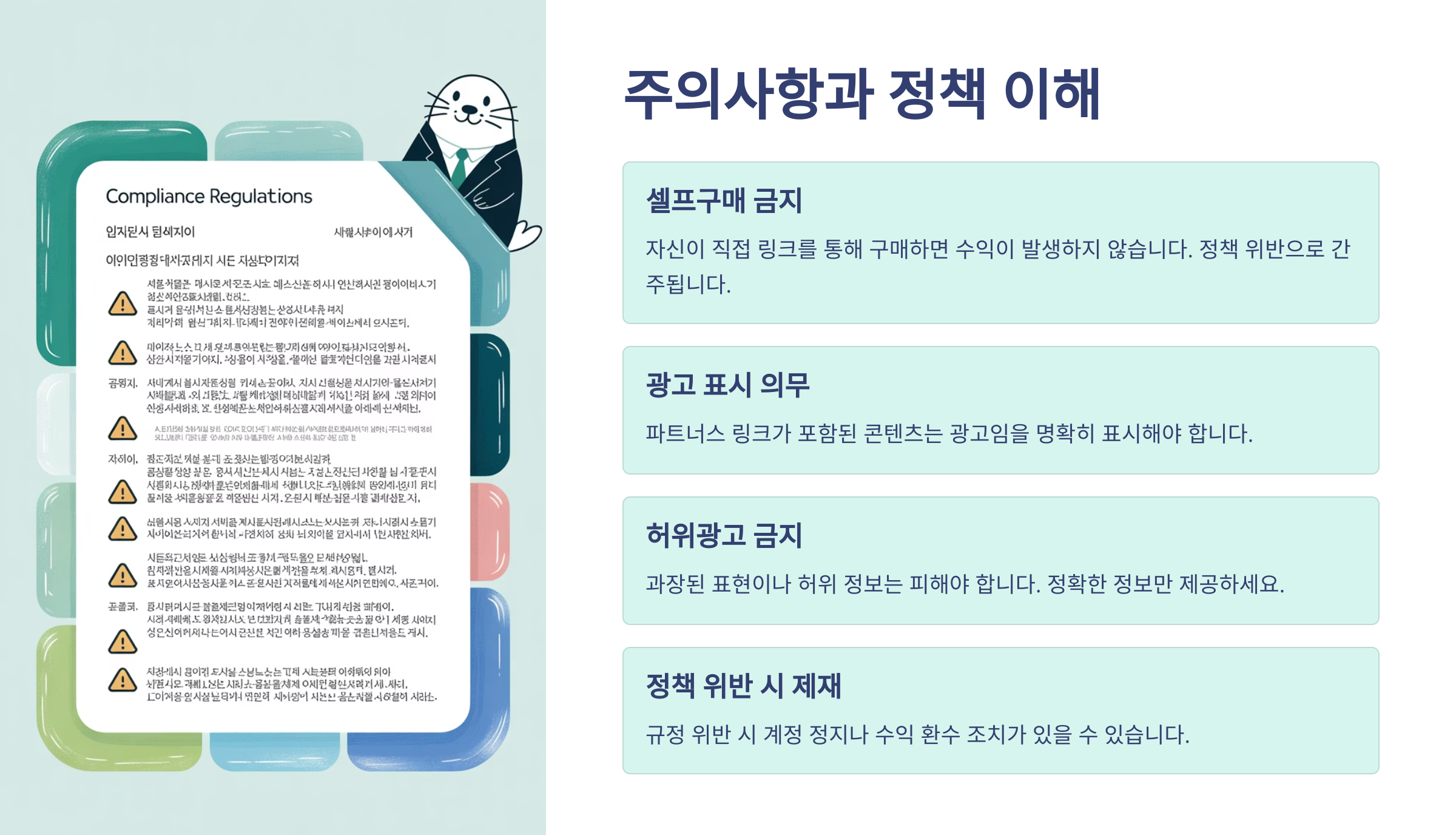 가장 대표적인 금지 행위는 ‘본인 구매’예요. 자신의 파트너스 링크를 통해 구매하면 수익이 발생하긴 하지만, 이는 명백한 정책 위반이고 적발 시 수익 전체가 몰수되거나 계정이 정지될 수 있어요.