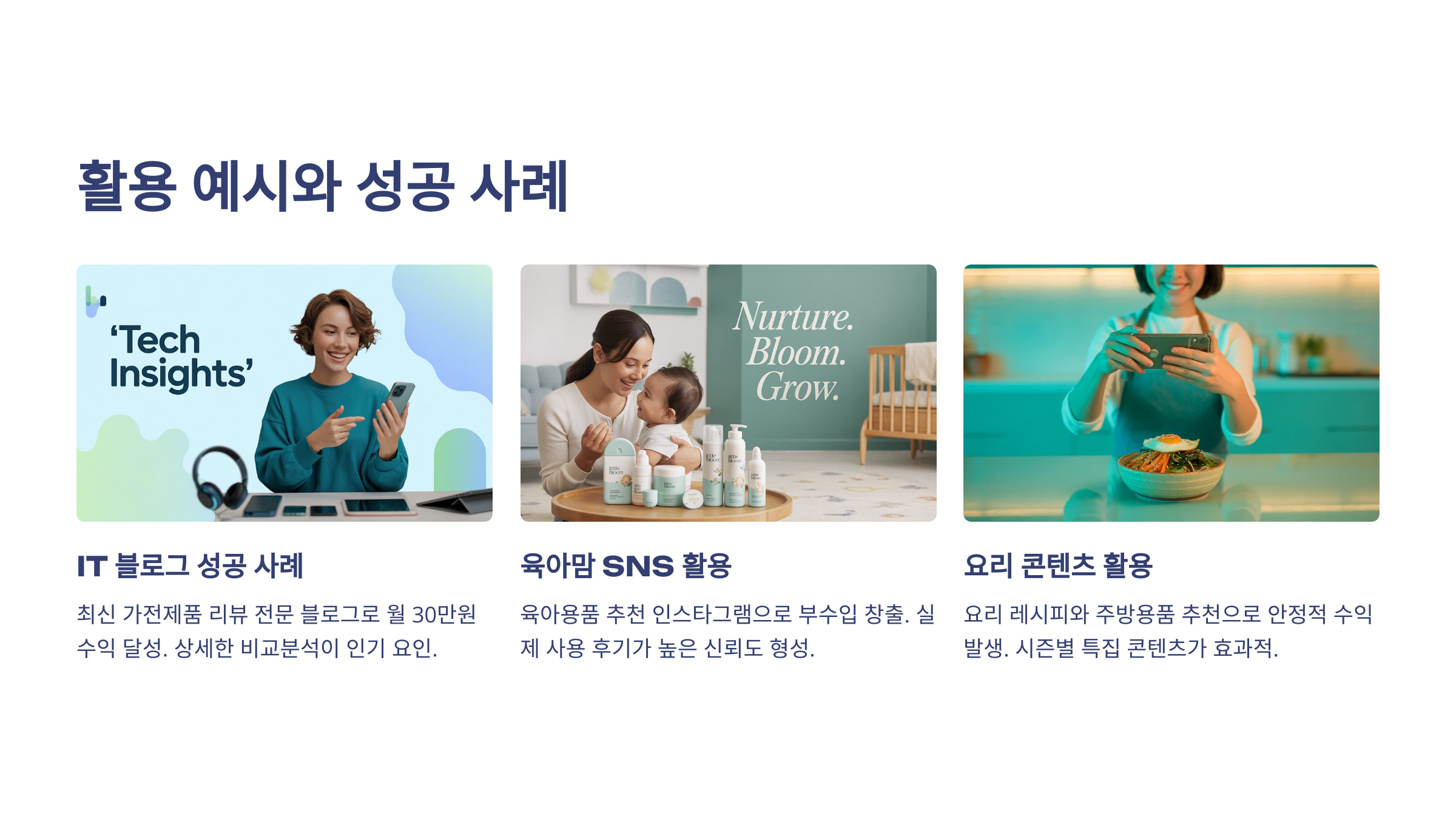 두 번째는 ‘콘텐츠 제작 방식’이에요. 링크만 덩그러니 올리기보단, 제품을 사용해본 후기를 블로그나 SNS에 정성스럽게 작성해보세요. 사용 방법이나 장단점, 비교 포인트 등을 자세히 소개하면 신뢰도가 높아져요.