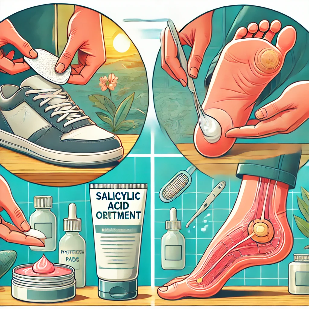 • 살리실산 연고: 각질을 부드럽게 하고, 티눈을 제거하는 데 효과적입니다. 사용 시에는 주변 건강한 피부에 닿지 않도록 주의해야 합니다. 살리실산은 피부의 각질을 녹여 티눈을 부드럽게 하는 데 도움을 줍니다.