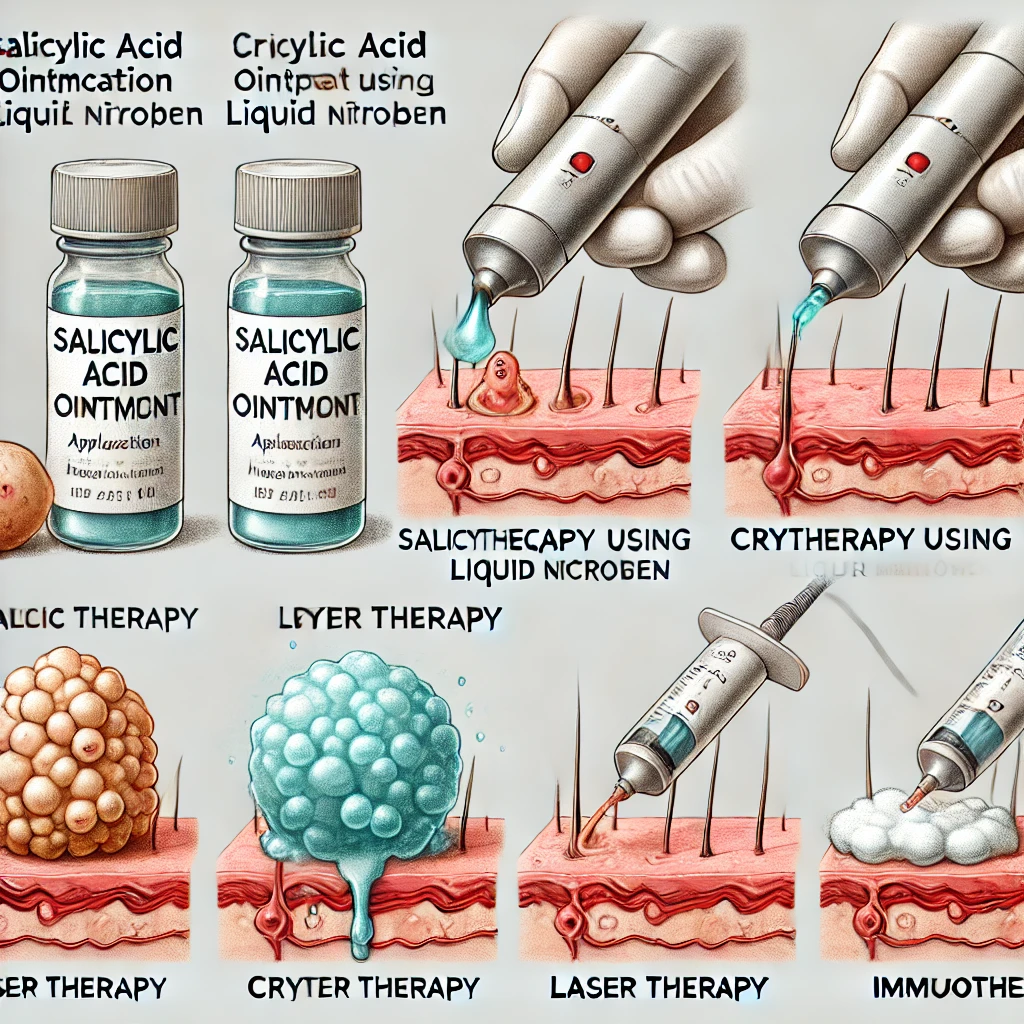 치료법 보호 패드, 각질 제거, 살리실산 연고 냉동 요법, 전기 소작술, 레이저 치료 살리실산, 냉동 요법, 레이저 치료