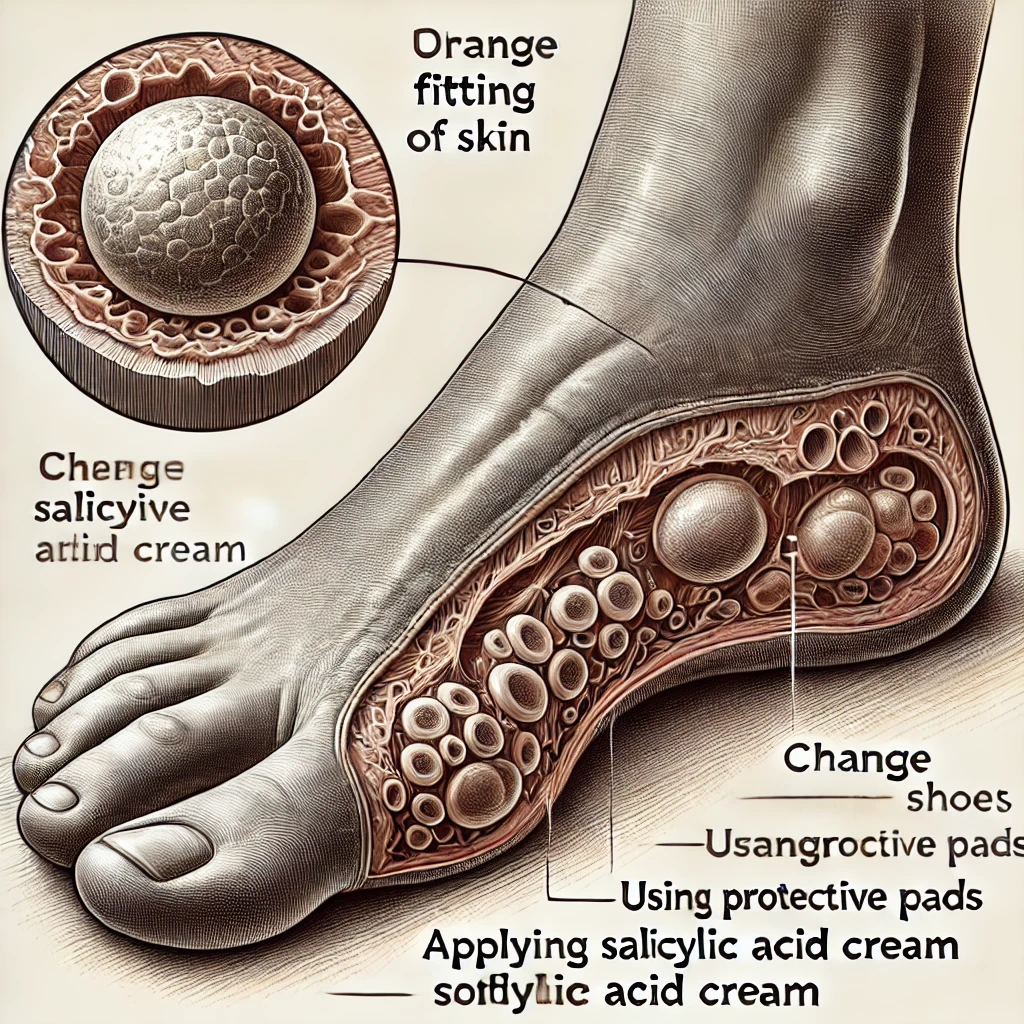• 신발 교체 및 보호 패드 사용: 발에 맞지 않는 신발을 교체하고, 압박 부위에 보호 패드를 사용하여 압력을 줄입니다. 이는 티눈의 원인을 제거하여 증상을 완화하는 데 도움이 됩니다.
