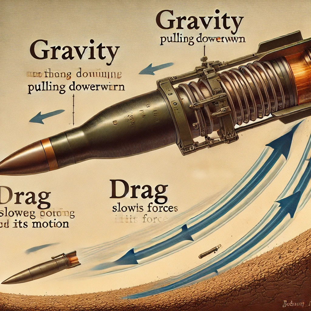 포탄의 비행 중 가장 크게 작용하는 힘은 중력입니다. 중력은 지구 중심 방향으로 작용하며, 포탄이 상승하는 동안 수직 속도를 점차 감소시키게 됩니다. 이로 인해 포탄은 최대 높이에 도달한 후 다시 하강하게 되며 포물선 궤도를 완성하게 됩니다.