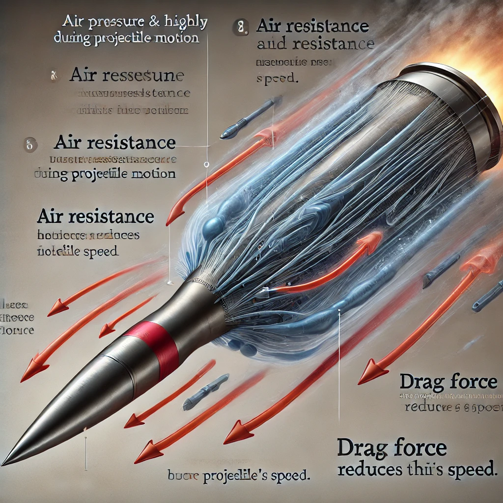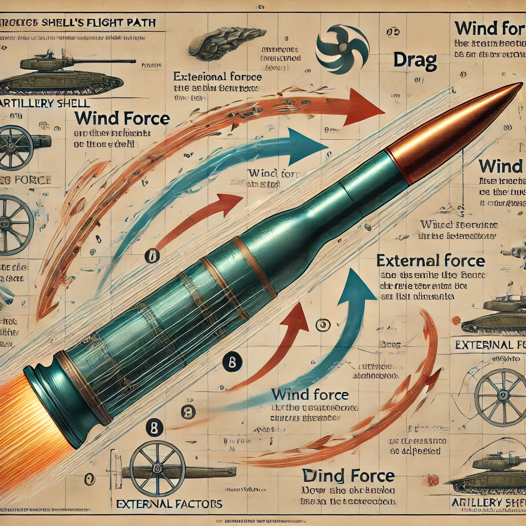 포탄의 비행에는 공기 저항이 큰 영향을 미칩니다. 공기 저항은 포탄이 이동하는 동안 공기와의 마찰로 인해 속도를 감소시키는 요소입니다. 공기 저항의 크기는 포탄의 속도, 공기의 밀도, 그리고 포탄의 형태에 따라 달라집니다.