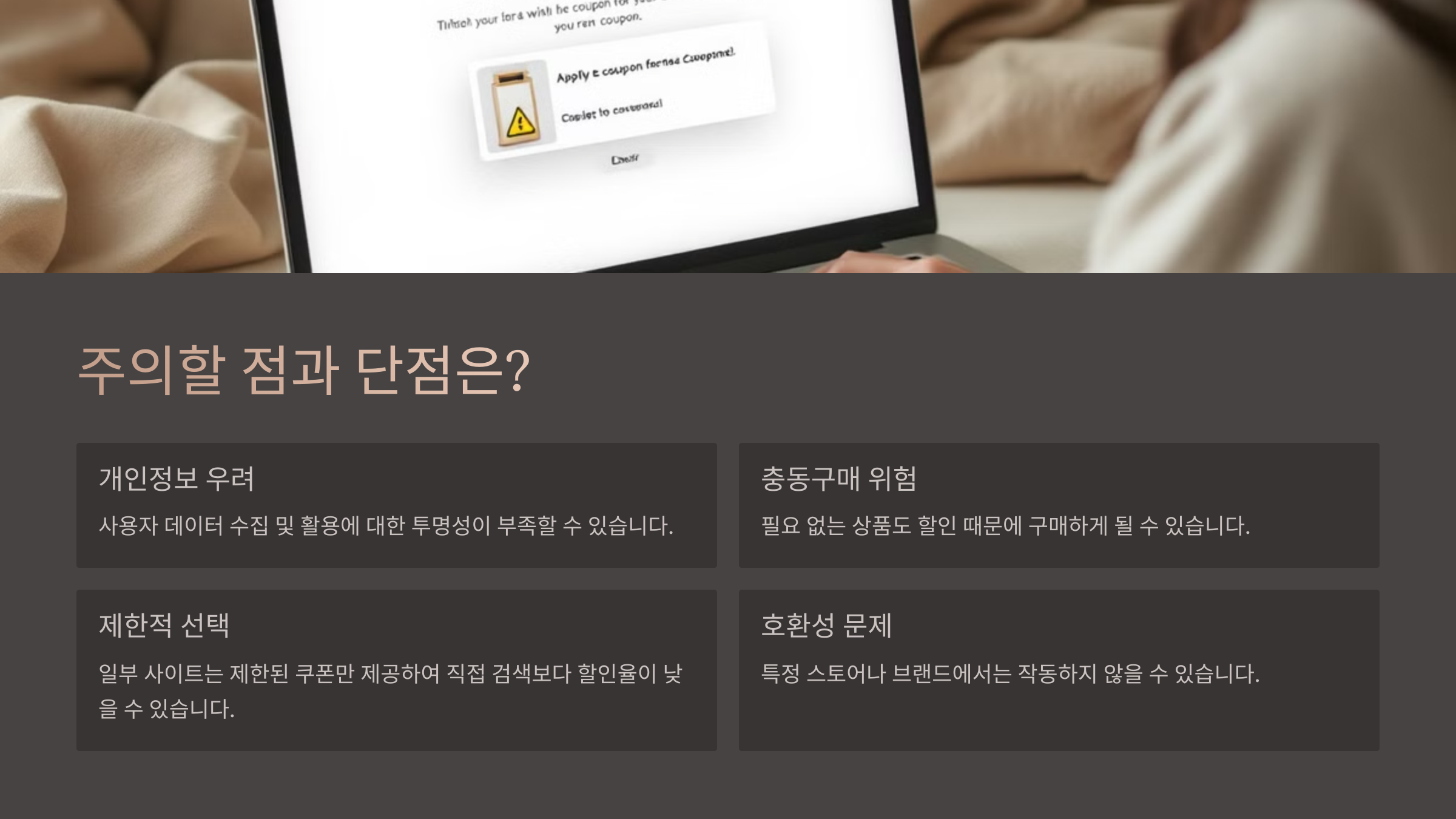 주의할 점과 단점 하지만 완벽해 보이는 자동 쿠폰 기능에도 아쉬운 점은 분명 있어요. 먼저, 대부분의 글로벌 쿠폰 자동 적용 사이트는 한국 쇼핑몰 지원이 제한적이거나 거의 없다는 점이에요. 예를 들어 쿠팡, 위메프, G마켓 등에서는 거의 작동하지 않아요.