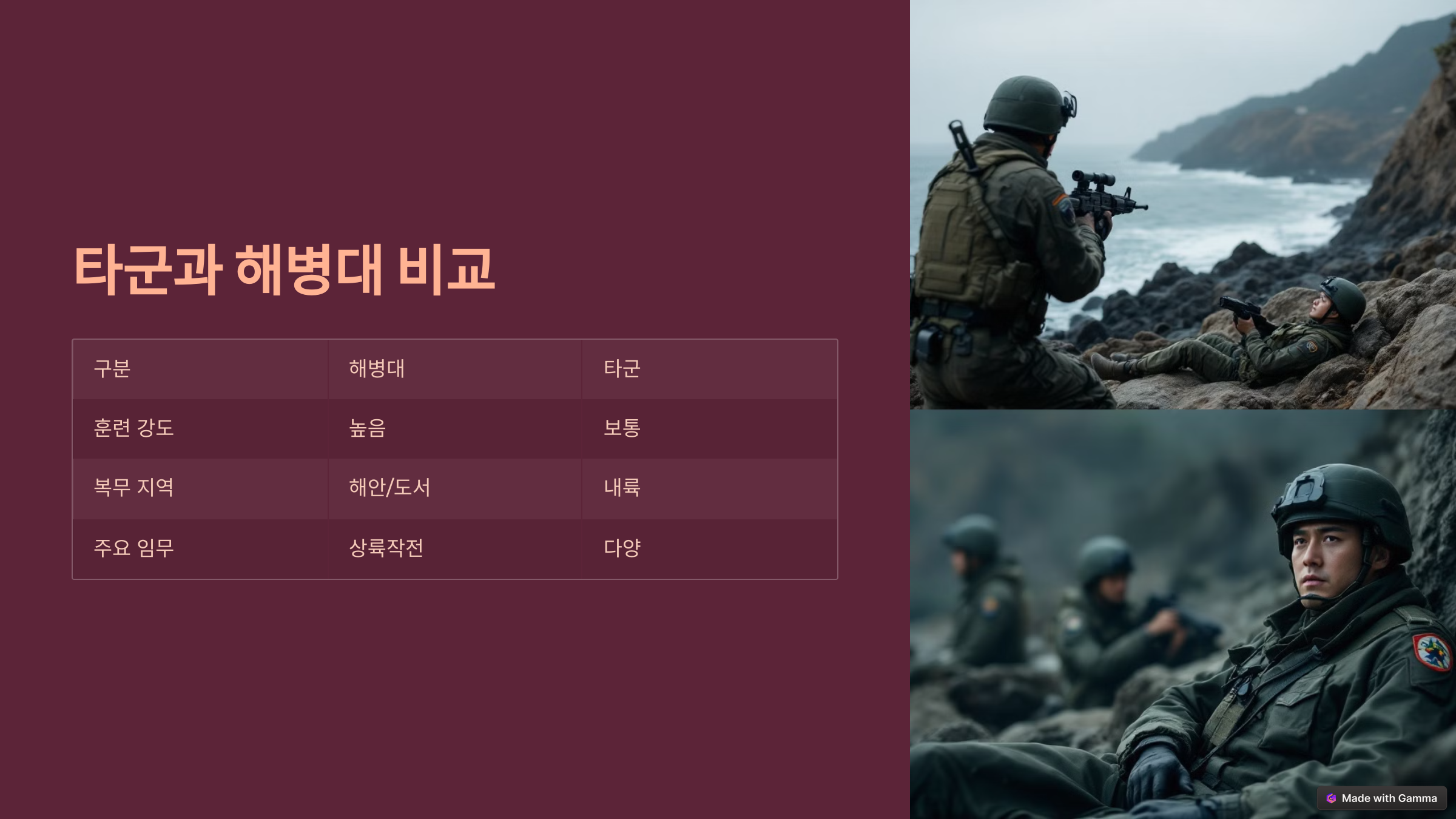 타군과 해병대 비교 해병대와 육군, 공군, 해군은 각기 다른 특징을 가지고 있어요. 어떤 군을 선택할지는 본인의 성향과 목표에 따라 달라질 수 있어요! 🎖