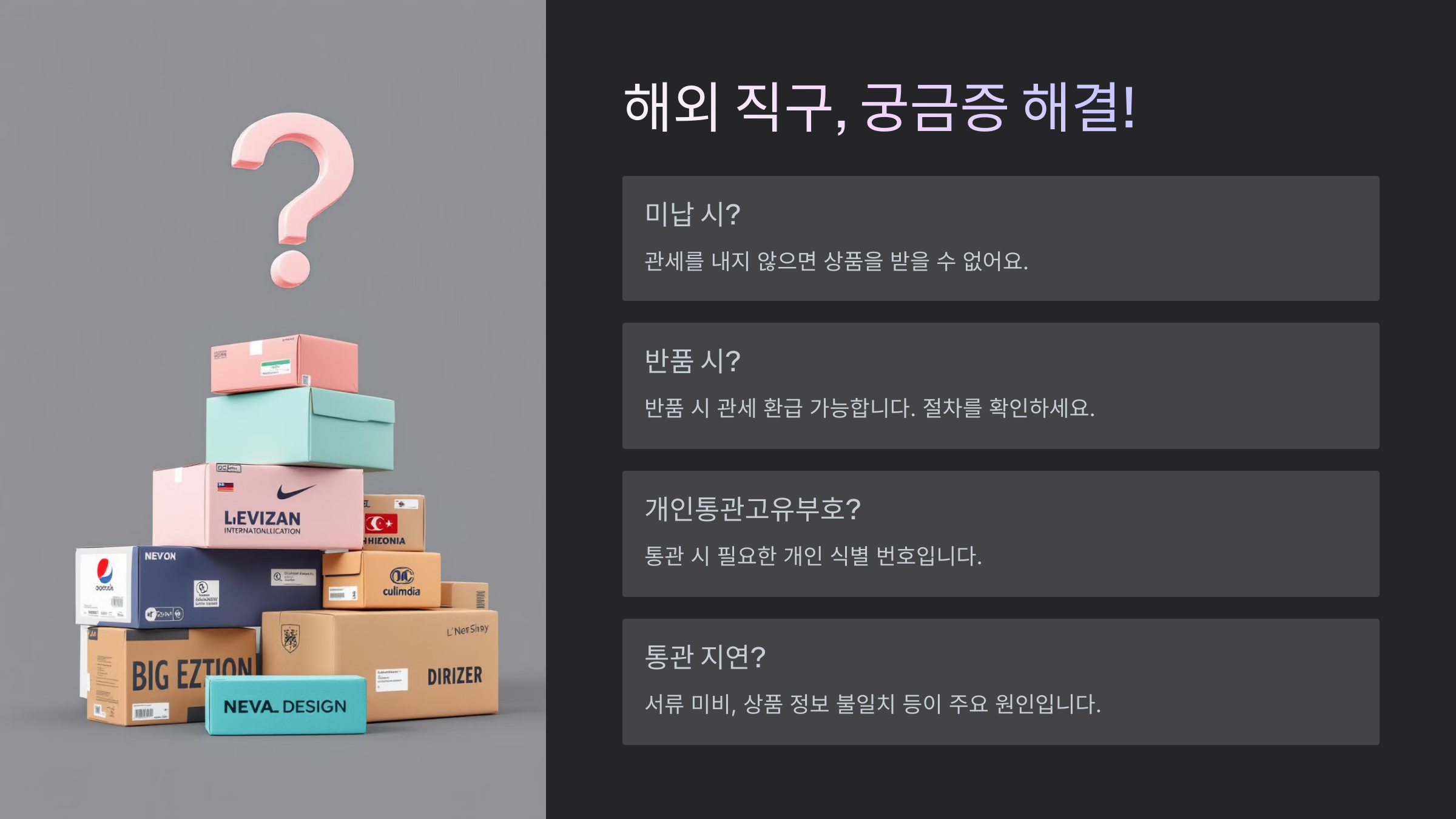 하지만 직구에는 문제가 하나 있죠. 바로 관세! 일정 금액 이상의 상품을 해외에서 구매하면, 한국 세관에서 이를 확인하고 세금을 부과할 수 있어요. 그래서 가격이 저렴하다고 하더라도, 예상보다 더 많은 비용을 지불할 수 있죠. 이 문제를 해결하려면, 관세에 대해 잘 알고 미리 대비하는 것이 중요해요.