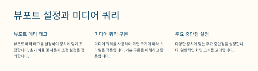 이렇게 설정하면 기기 화면 크기에 맞게 자동 조정돼서 모바일에서도 깨지지 않아요. 하지만 화면 크기에 따라 글자 크기나 레이아웃을 조정하려면 CSS 미디어 쿼리를 활용해야 해요.