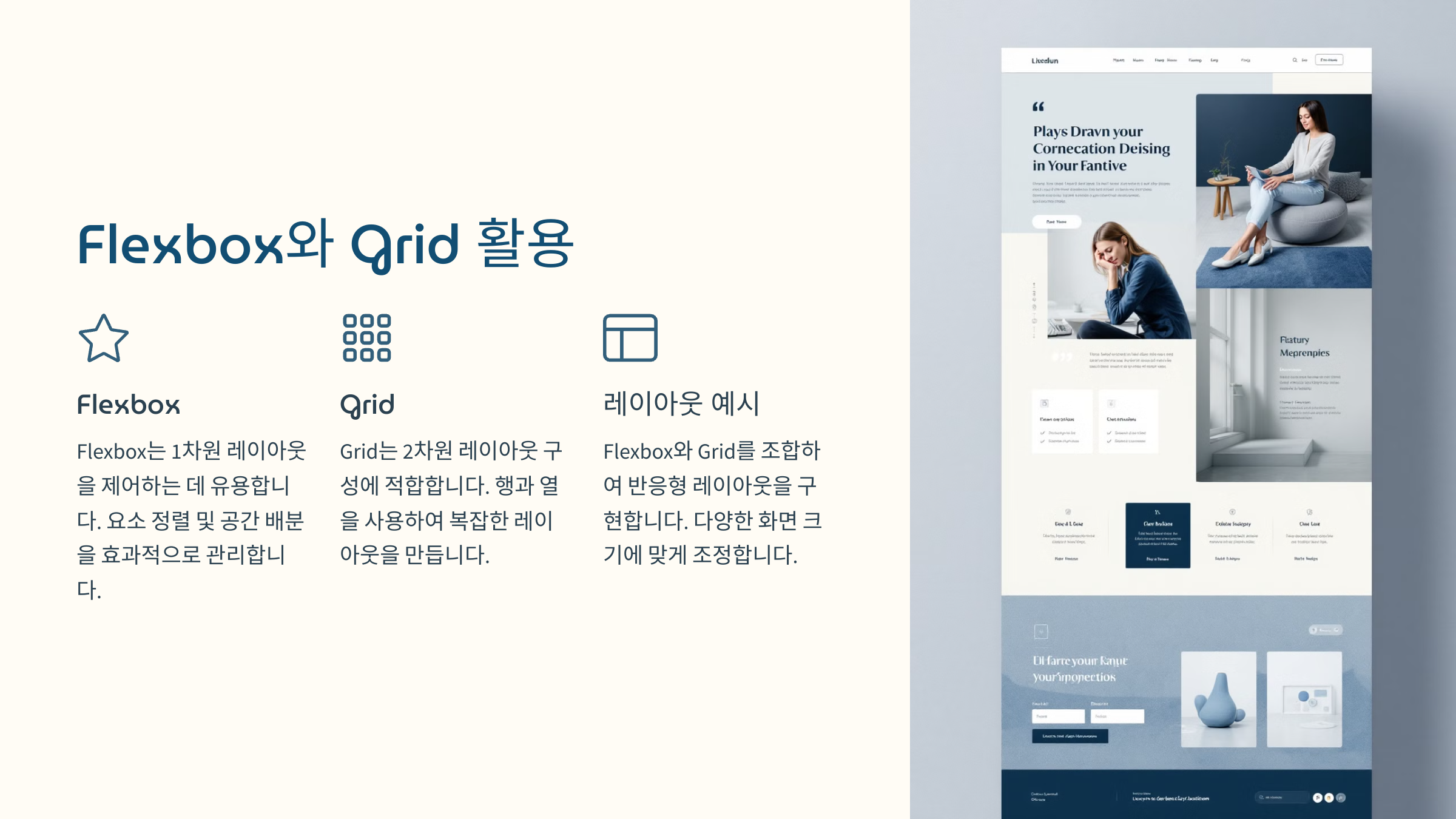 Flexbox는 한 줄(row) 또는 한 열(column) 내에서 요소를 배치하는 데 적합하고, Grid는 전체 페이지 레이아웃을 구성하는 데 유용해요. 따라서 두 가지를 적절히 조합하면 최고의 반응형 디자인을 만들 수 있어요! 🎯