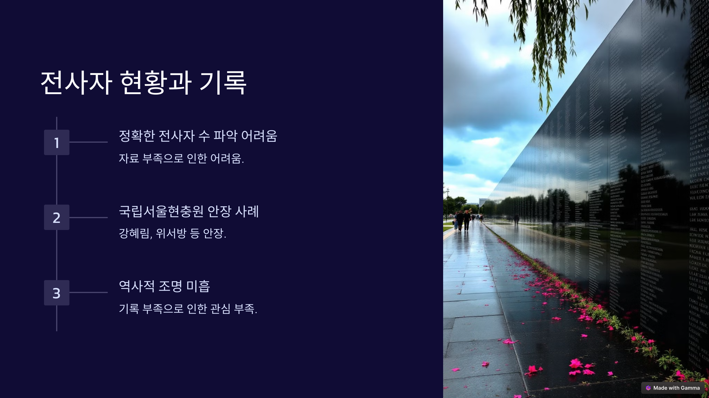 A4. 일부 전사자는 국립묘지에 안장되었고, 소규모 기념 행사가 열리기도 해요. 하지만 전체적으로 공식적인 평가나 보상이 부족한 상황이에요.