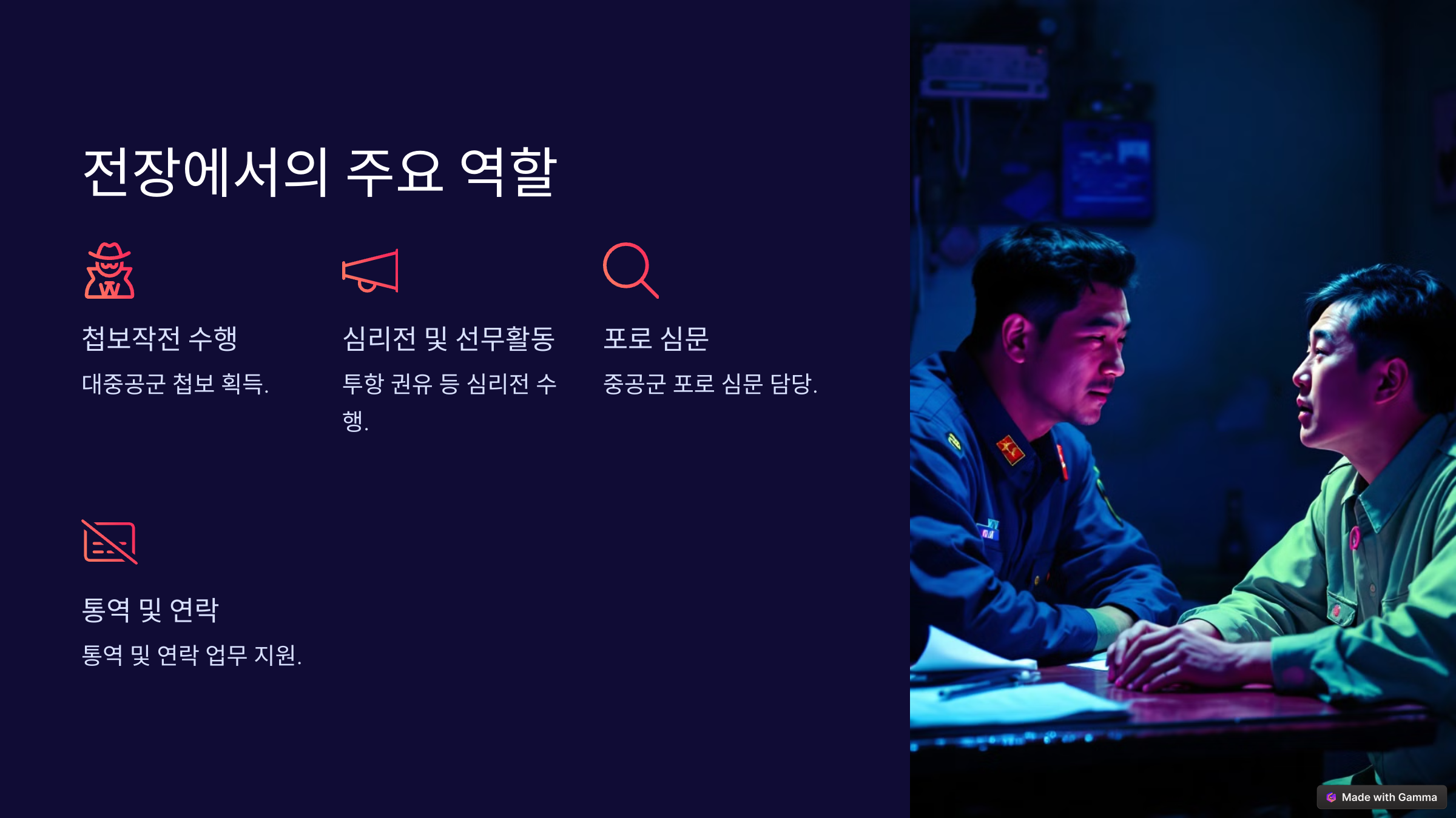 전장에서의 주요 역할 화교 의용군은 단순히 전투에 참여하는 것뿐만 아니라 다양한 방식으로 국군과 UN군을 지원했어요. 이들은 정보전, 보급 지원, 전투 수행 등 여러 분야에서 중요한 역할을 했죠.