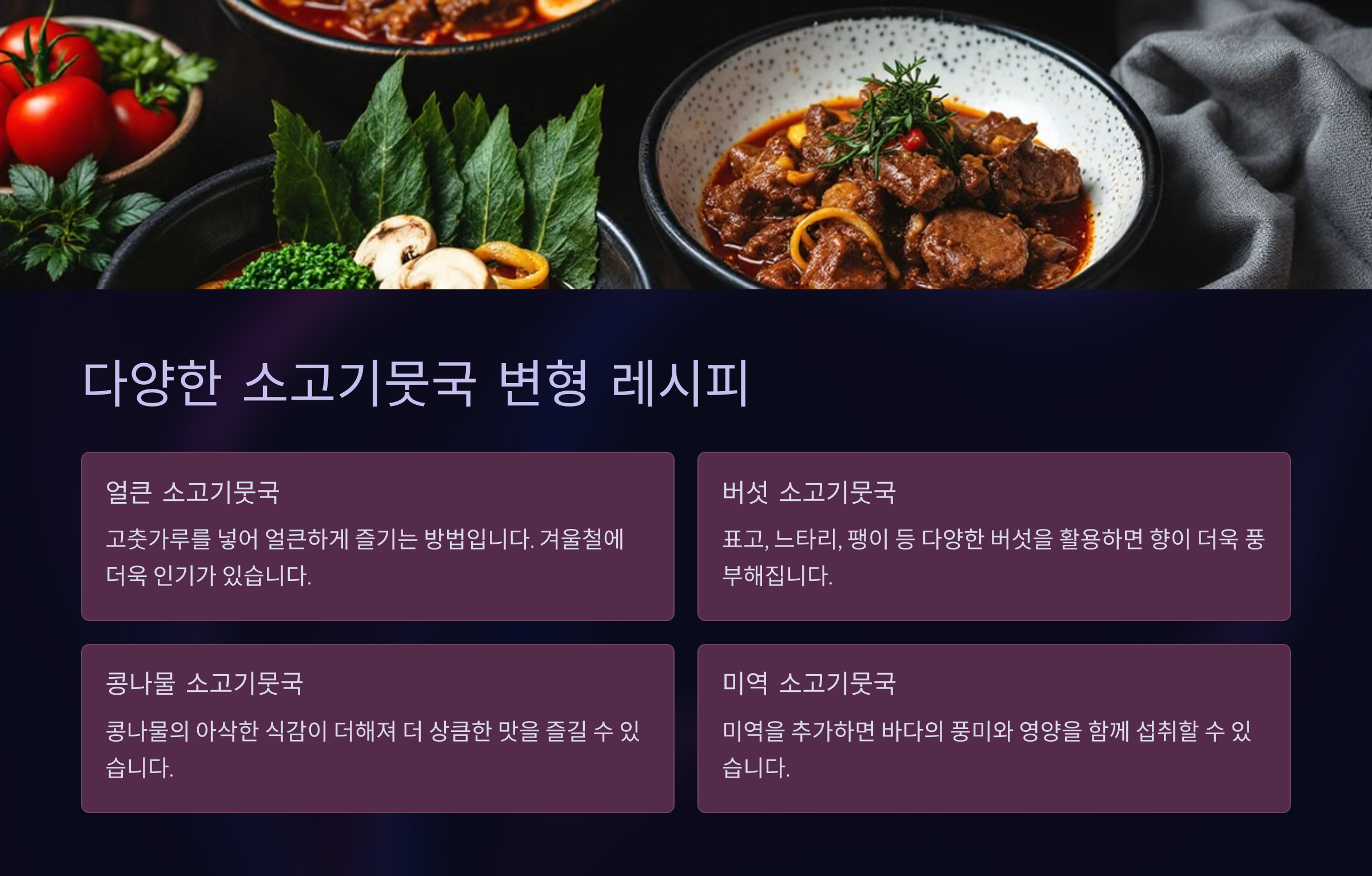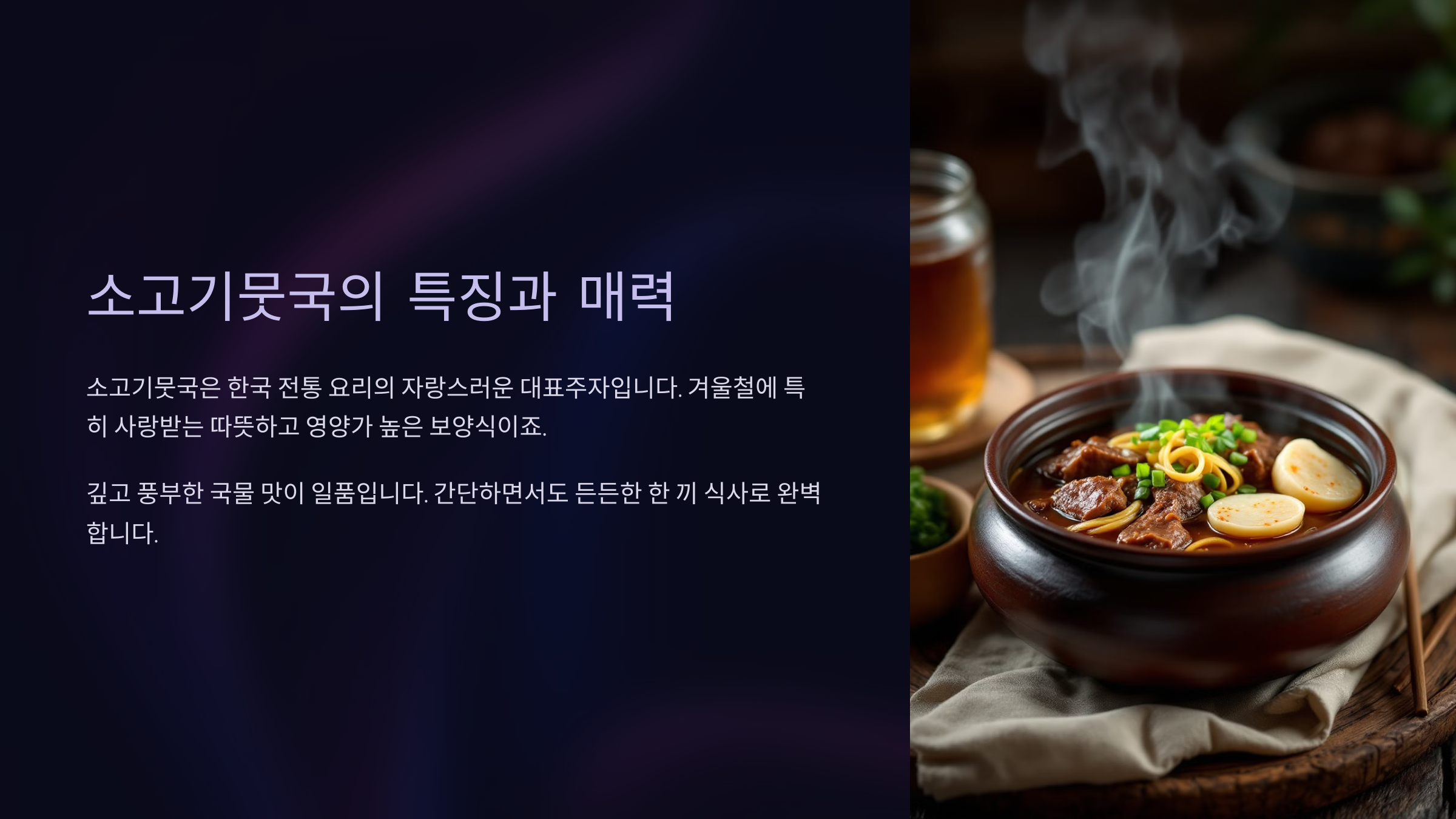 - 🦴 사골 소고기뭇국 – 물 대신 사골 육수를 사용하면 더욱 진한 국물이 완성돼요.