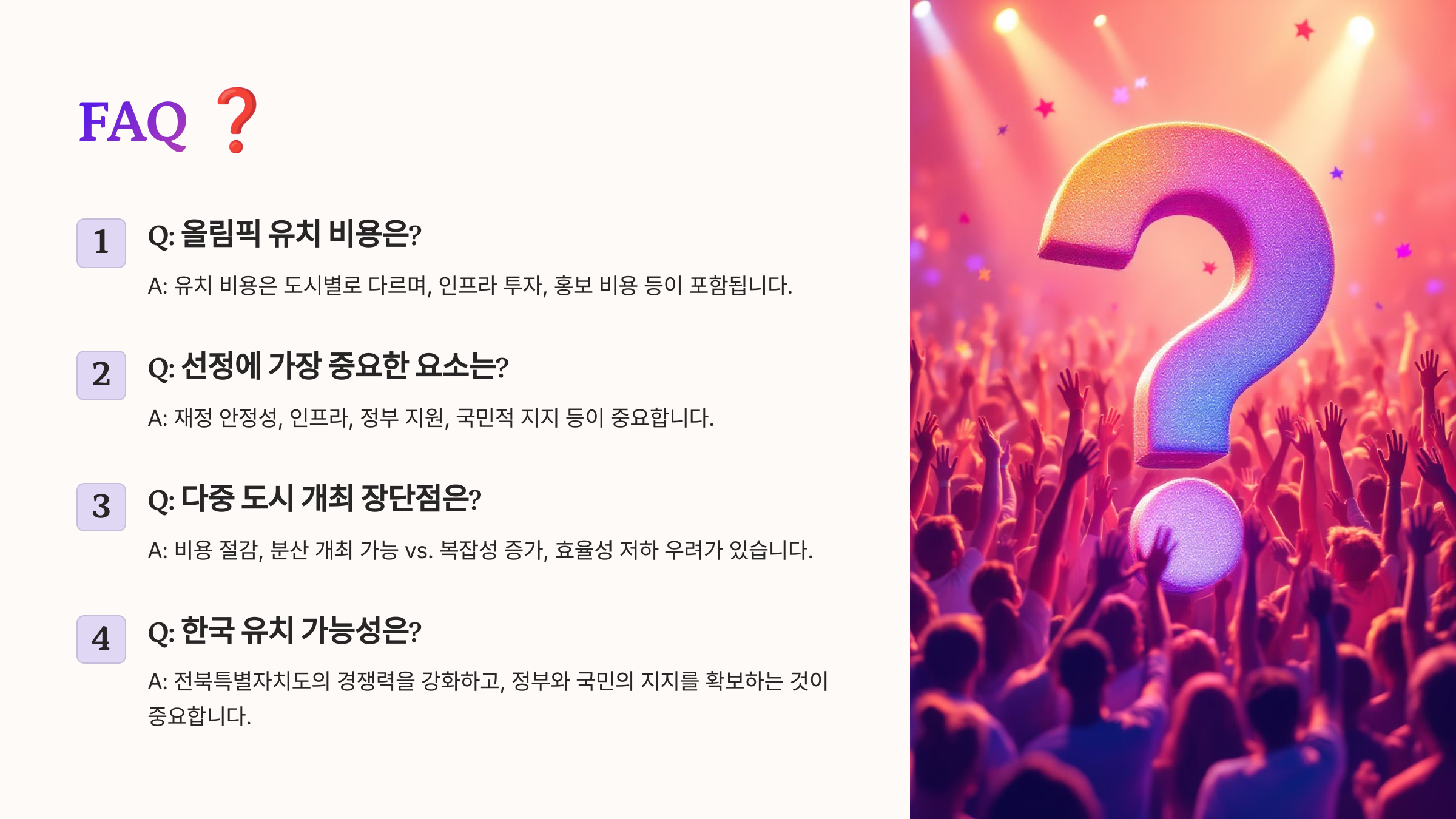 A3. 인프라 개선, 관광객 증가 같은 긍정적 효과가 있지만, 과도한 지출로 부채가 늘어날 위험도 있어요.
