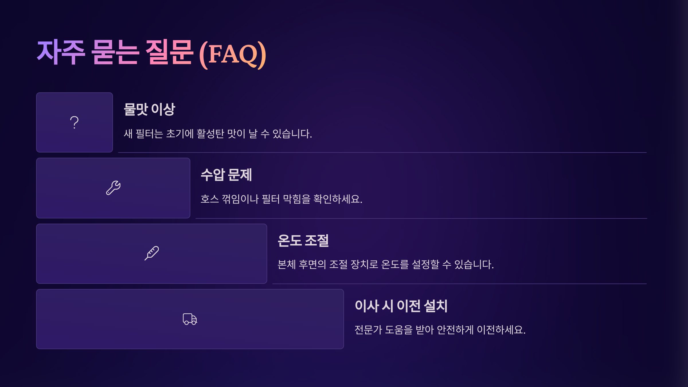 Q1. 정수기는 스스로 설치할 수 있나요?A1. 간단한 직수형 정수기는 설명서대로 하면 가능하지만, 복잡한 구조나 수도공사가 필요한 경우엔 전문가에게 맡기는 게 좋아요.