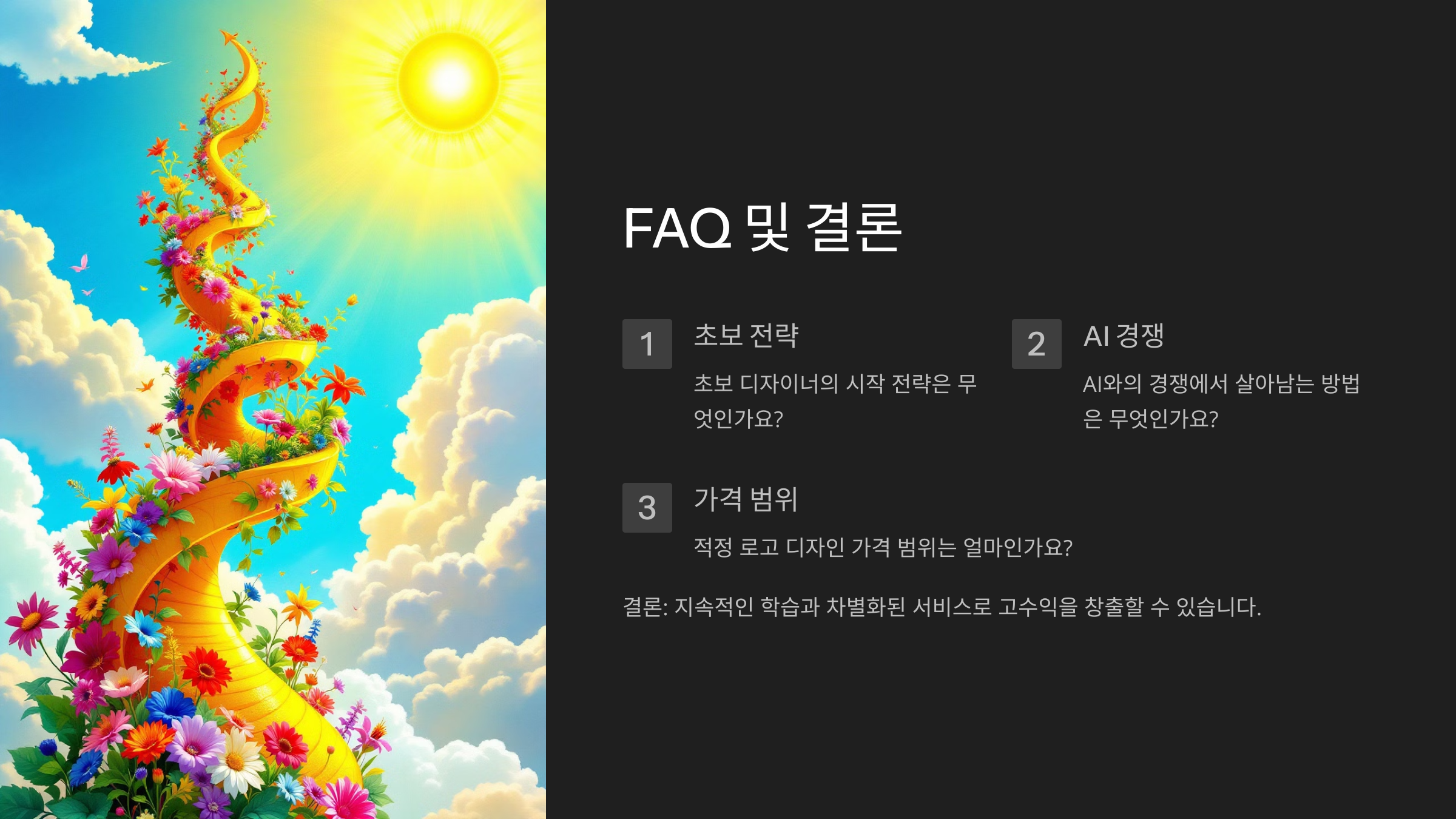 A8. 특정 스타일(미니멀, 손그림 등)을 전문으로 하거나, 브랜드 컨설팅을 함께 제공하면 경쟁력이 올라가요.