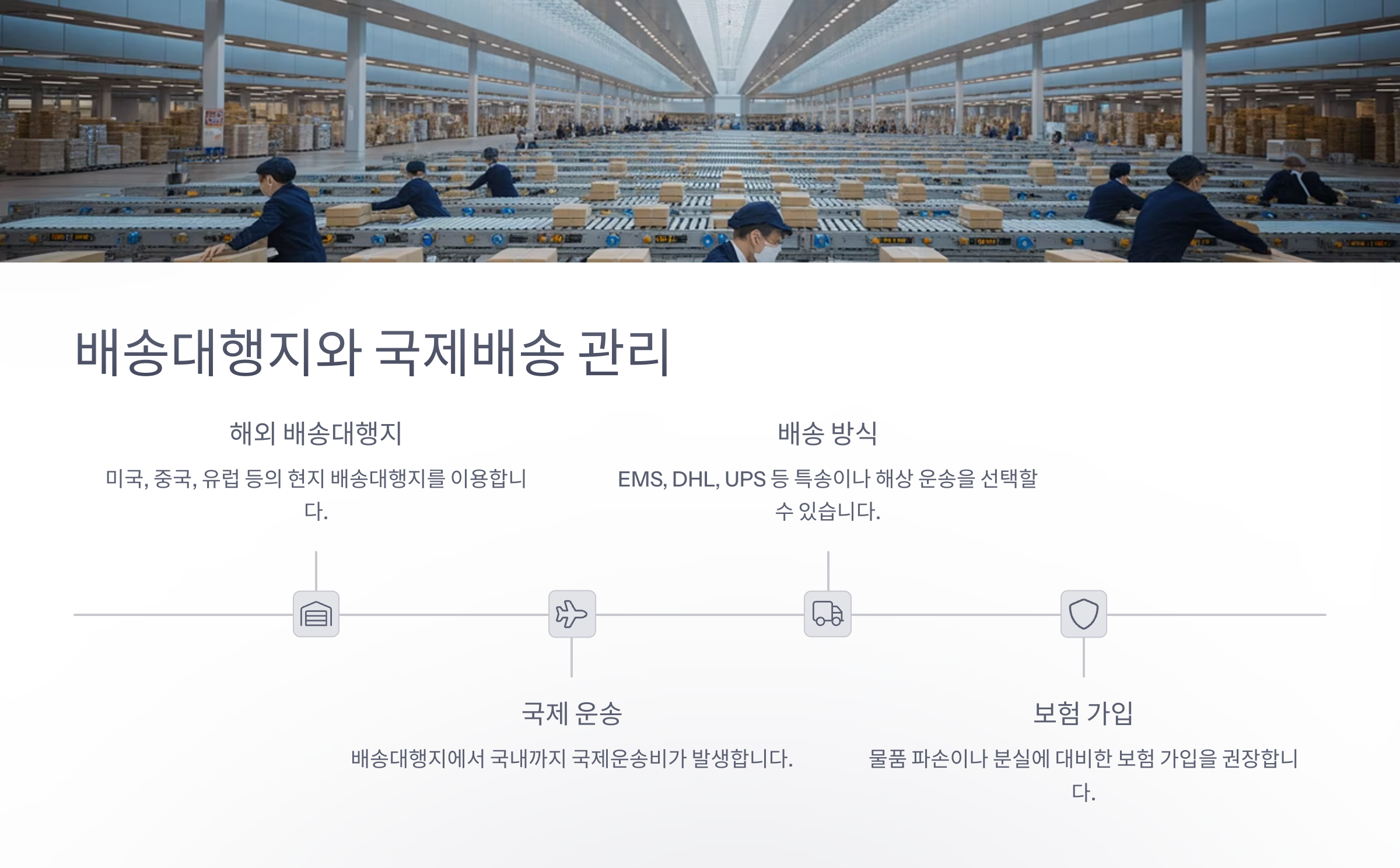 구매한 해외 상품은 ‘배송대행지’를 통해 한국으로 보내야 해요. 배송대행지는 일종의 중간 창고로, 여기에 먼저 물건이 도착하고 이후 한국 주소로 전달되는 구조예요. 📦