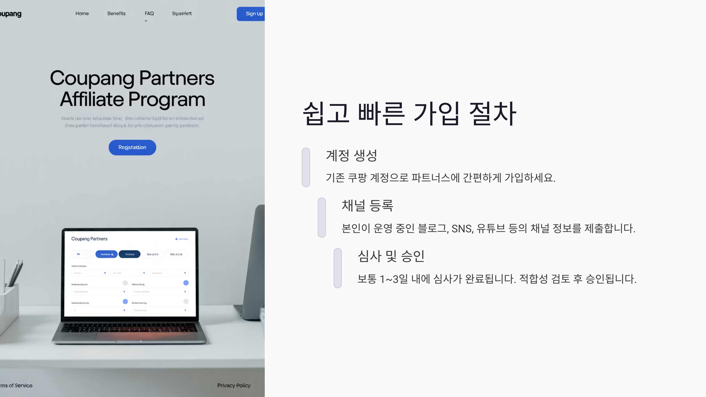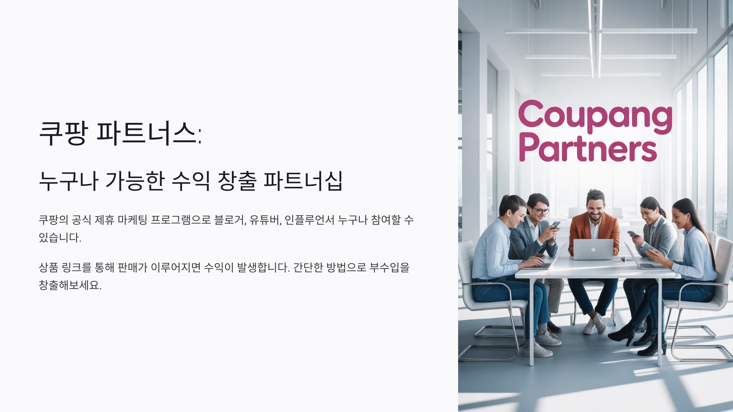 가입 방법과 승인 절차 쿠팡 파트너스는 누구나 쉽게 가입할 수 있어요. 사업자가 아니어도 되고, 이메일과 블로그나 SNS 계정만 있으면 신청 가능해요!