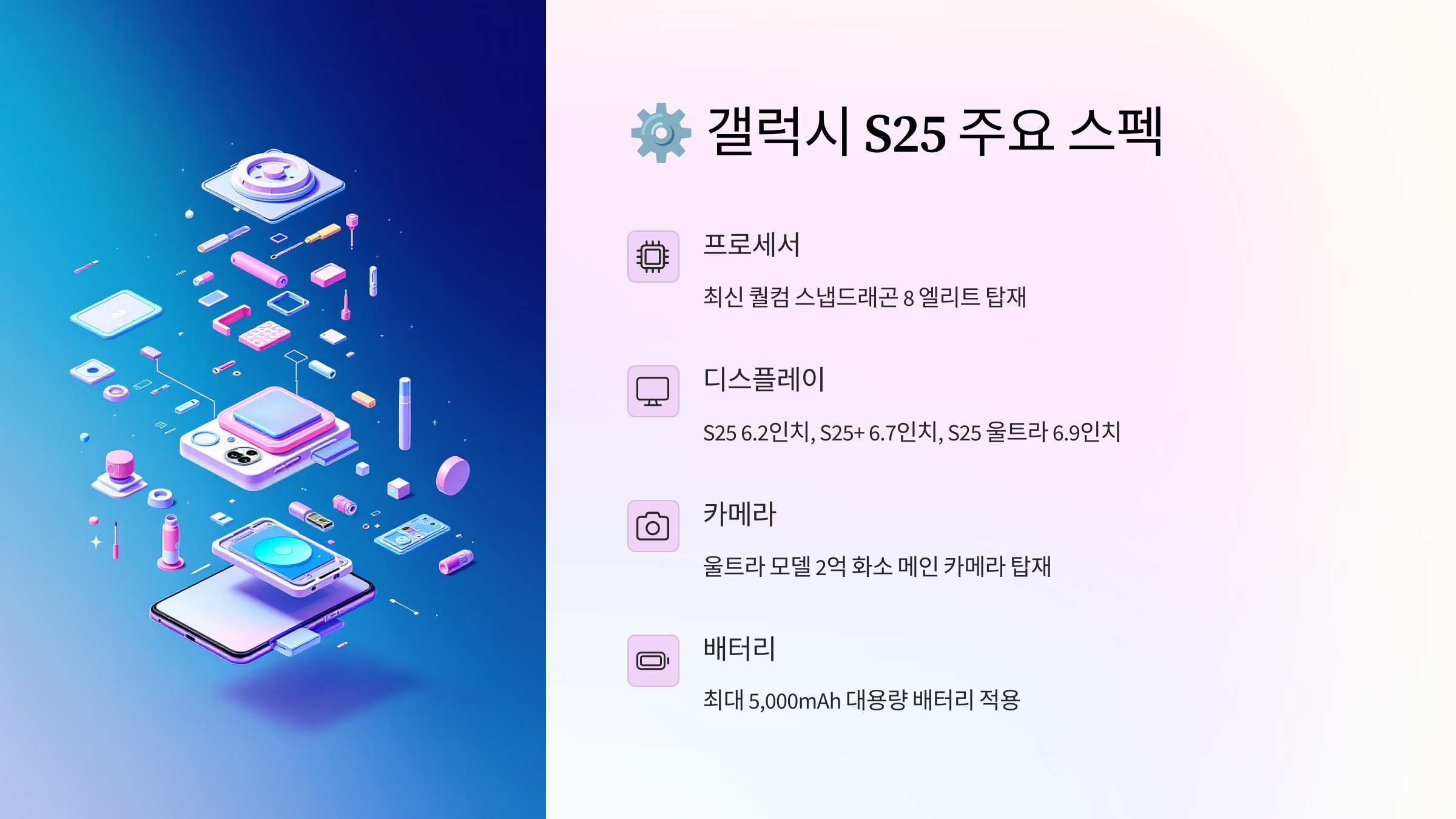 이제, 갤럭시 S25의 주요 스펙을 살펴볼까요? ⚙