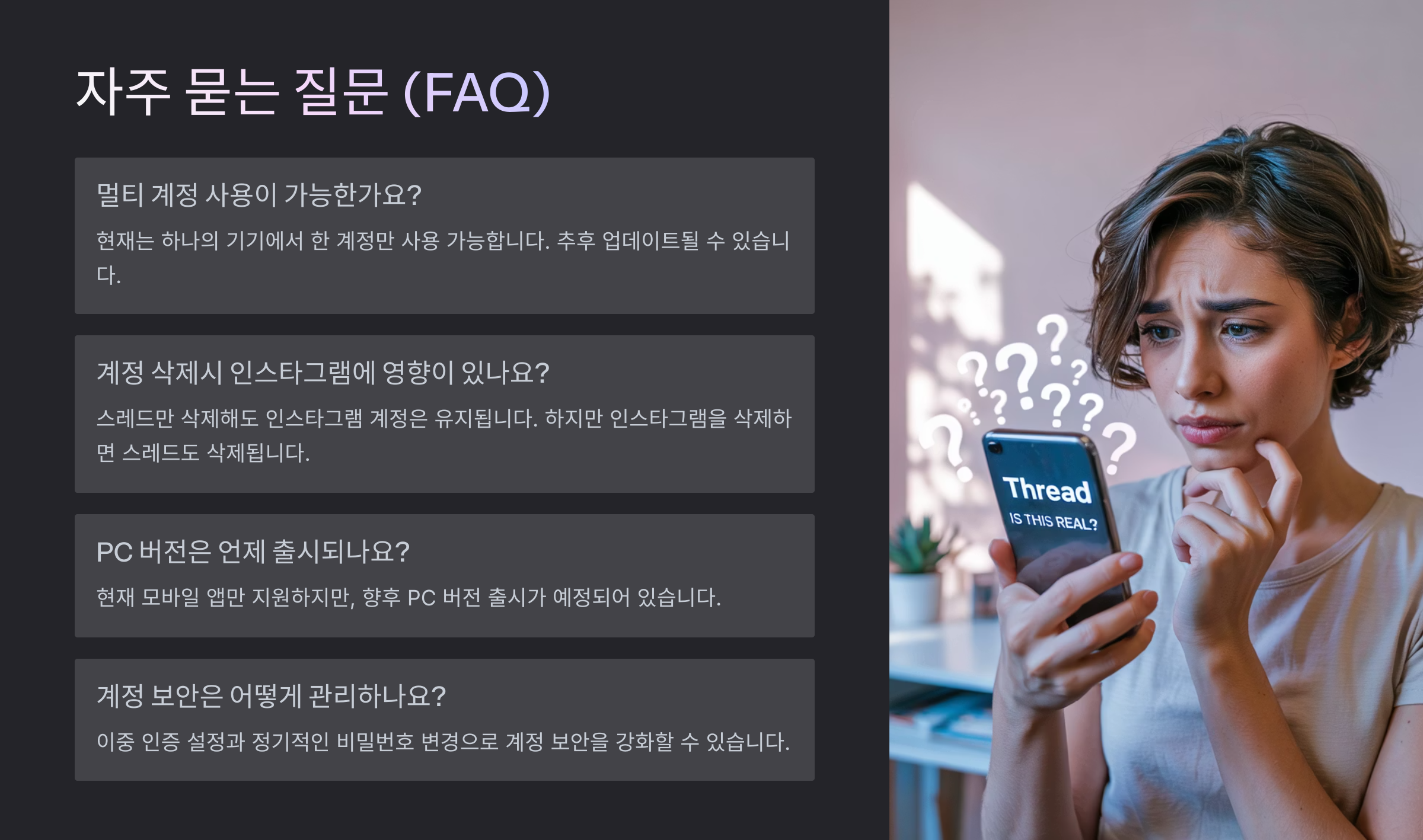 A8. 스레드는 인스타 계정과 연동되어 있어 완전한 삭제 시 인스타 계정도 영향을 받을 수 있으니 주의해야 해요.