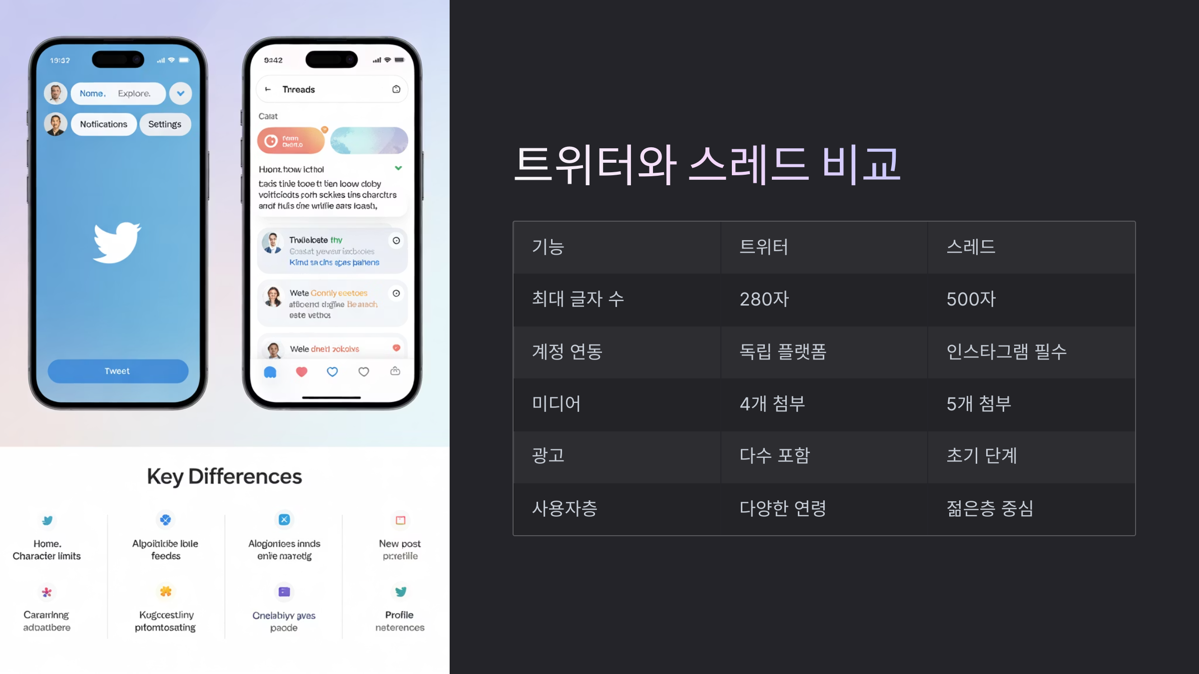 많은 사람들이 스레드를 접하면서 가장 궁금해하는 건 “트위터랑 뭐가 다른가요?”예요. 둘 다 짧은 텍스트 중심의 플랫폼이고, 리트윗이나 댓글 기능도 유사하지만, 구조와 운영 방식, 사용자층에서 차이가 확실히 드러난답니다.