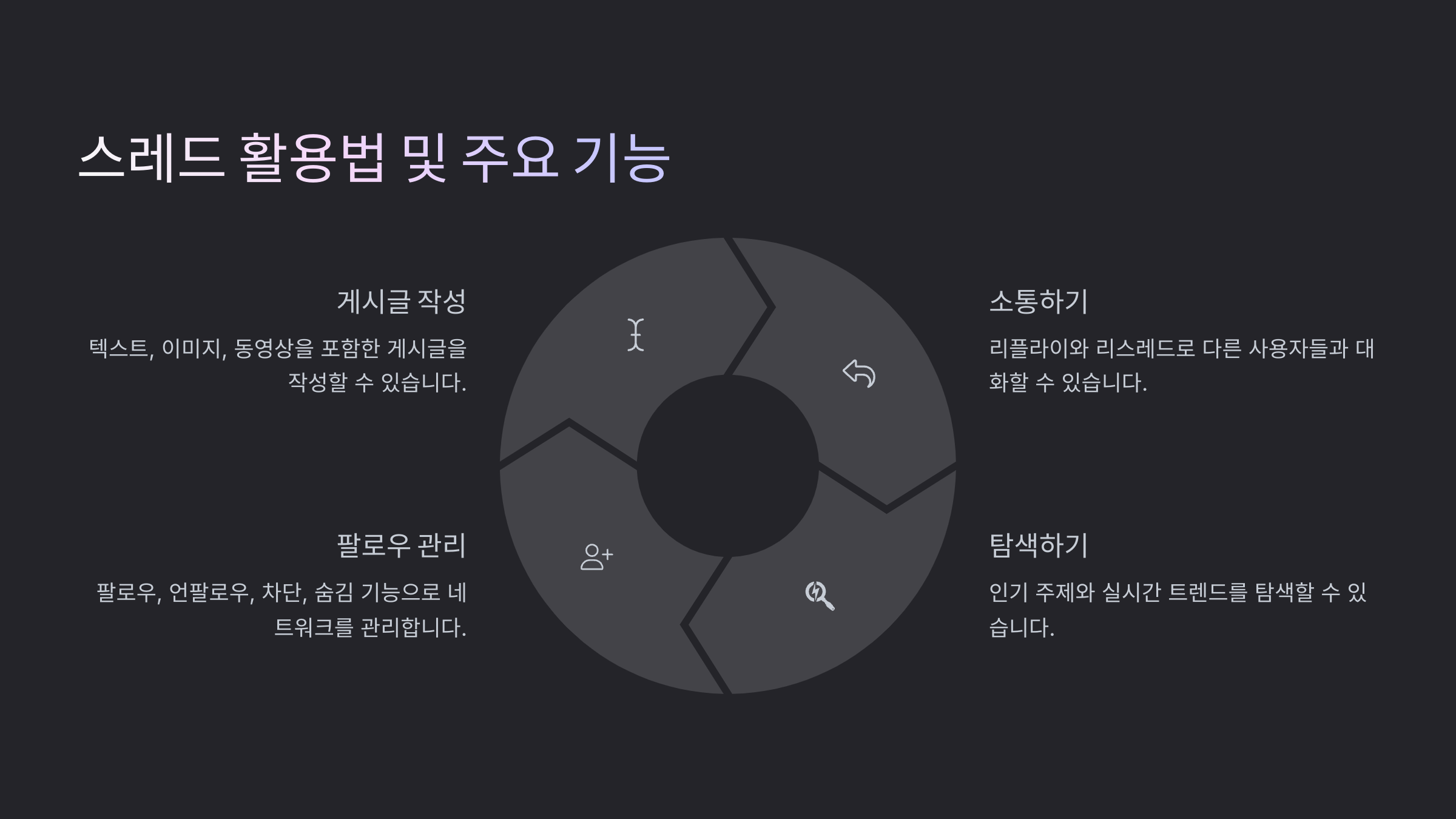 이제 스레드를 어떻게 활용하면 좋을지, 그리고 어떤 기능이 있는지를 살펴볼 차례예요! 스레드는 짧고 간결한 텍스트 포스팅이 중심이지만, 그 안에서도 창의적인 표현과 깊이 있는 소통이 가능하다는 점에서 정말 매력적인 플랫폼이에요.