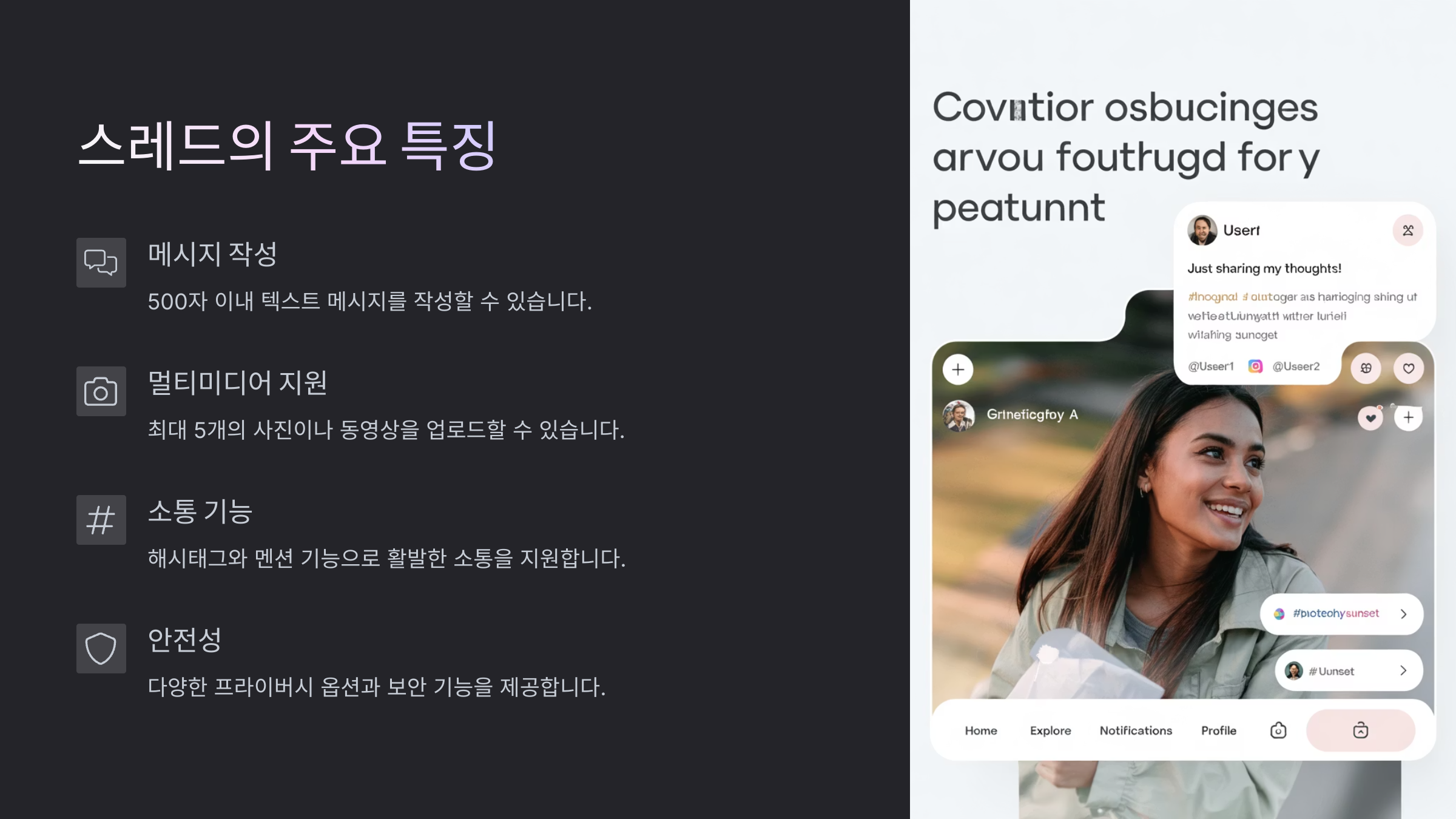 또한, 사용자는 게시글에 댓글을 달거나, '리스레드'(트위터의 리트윗처럼) 기능을 통해 다른 사람의 글을 자신의 타임라인에 공유할 수 있어요. 마음에 드는 게시물은 좋아요(♥)를 누를 수도 있답니다. 이런 상호작용들이 활발히 이루어지면서 진짜 커뮤니티가 만들어져요.