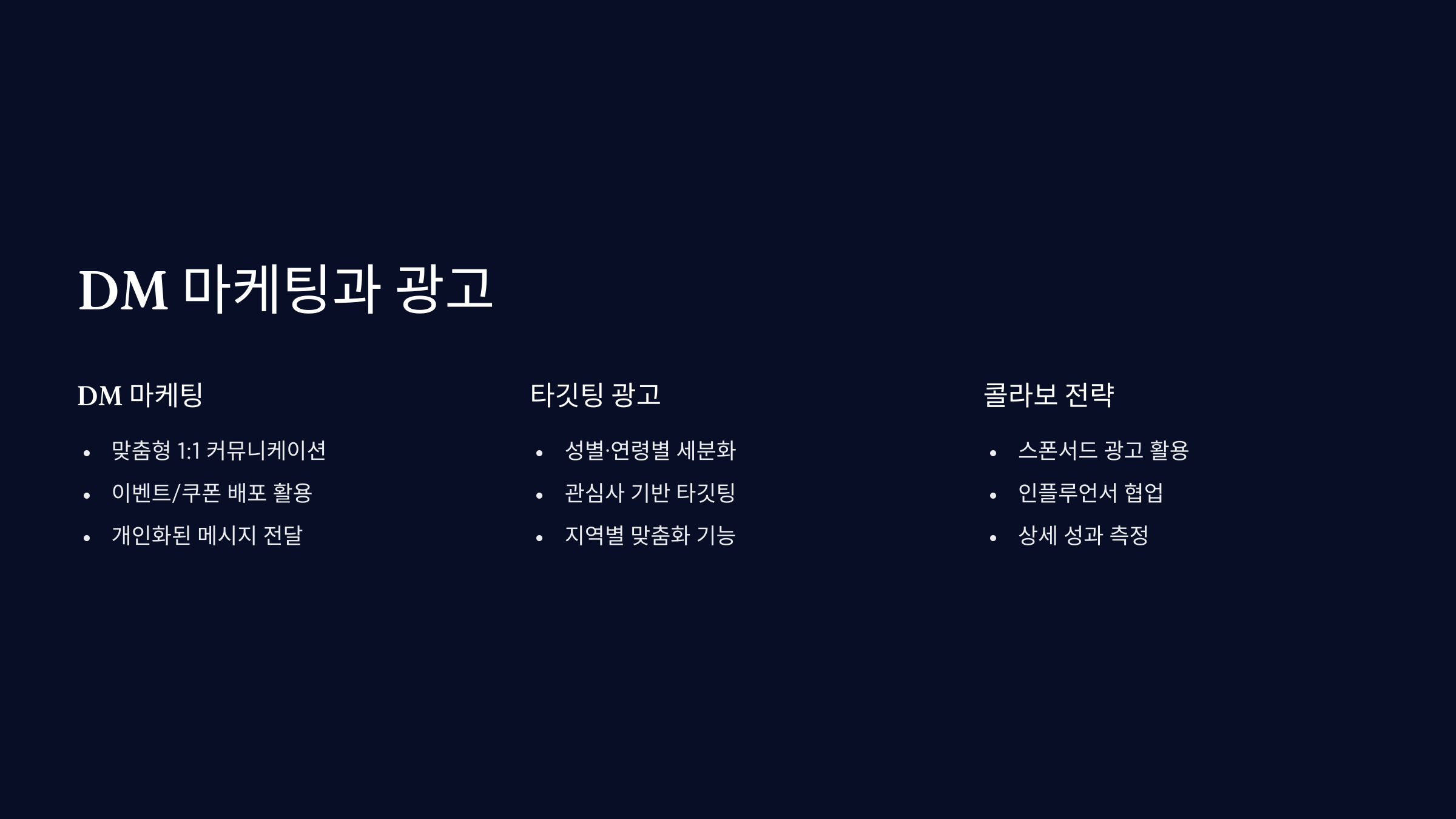 📬 DM 전략 - DM 유도 문구: “자세한 정보는 DM 주세요” - 자동응답 세팅 (챗봇) - 이모지+감성 톤으로 접근