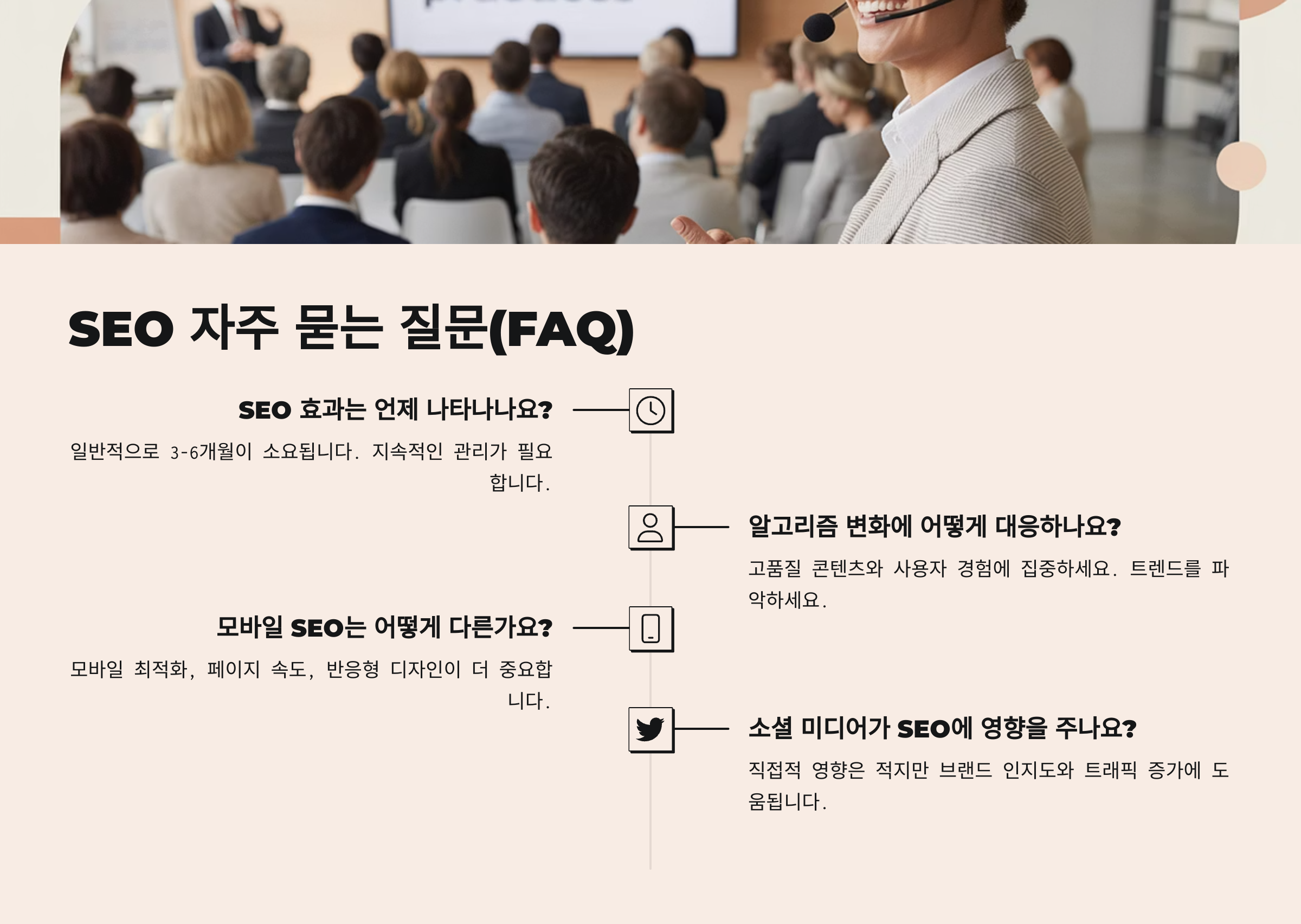 Q1. SEO는 네이버와 구글에 동시에 적용되나요?A1. 네, 기본 원리는 같지만 우선순위 요소가 달라요. 네이버는 체류시간과 공감수, 구글은 키워드 구조와 링크를 더 중요하게 봐요.