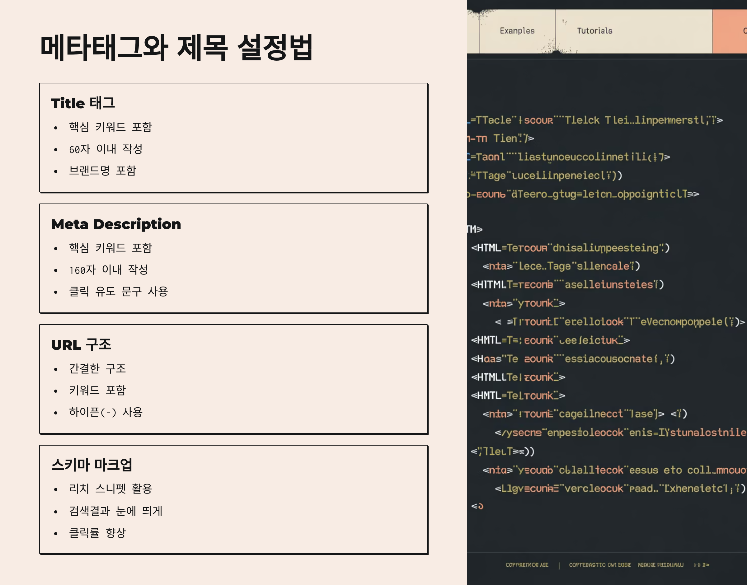 메타태그는 검색엔진에게 “이 글이 어떤 내용인지” 알려주는 역할을 해요. 제목, 설명, URL, 썸네일 모두 SEO 요소로 작용해요!📝 제목 설정 팁 - 키워드는 앞부분에 배치 - 길이는 35자 이내로 간결하게 - 수치, 연도, 구체적인 단어 포함 예) 2025 블로그 SEO 최적화 핵심 전략
