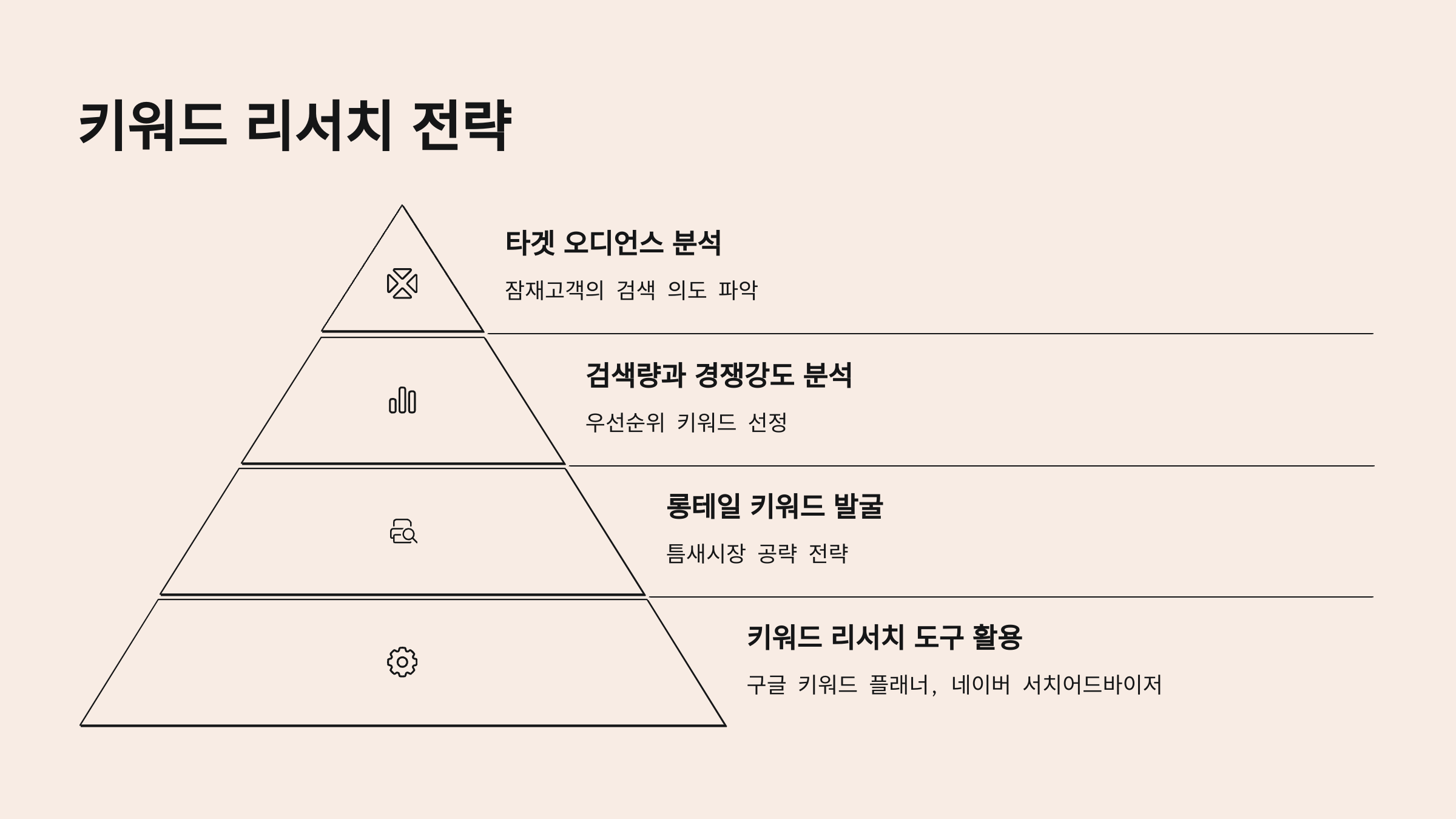 키워드 리서치 전략 SEO의 시작은 키워드예요. 어떤 단어로 검색했을 때 내 글이 뜨기를 원하는지부터 설정해야 해요. 감이 아니라 ‘데이터’로 접근하는 게 핵심이에요!