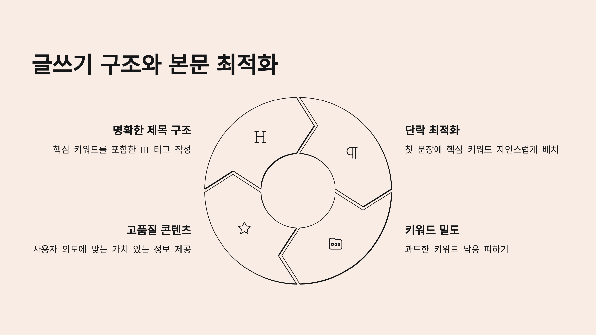 키워드를 정했다면, 이제 본문을 SEO에 맞게 써야 해요. 가장 중요한 건 구조화예요. 검색엔진은 구조가 명확한 글을 더 신뢰해요!✍ SEO 글쓰기 공식 1. 제목에 키워드 포함 2. 첫 문단에 키워드 반복 3. 중간 소제목에 키워드+변형어 삽입 4. 본문 중 1.5% 키워드 밀도 유지 5. 마지막 문단에도 키워드 정리